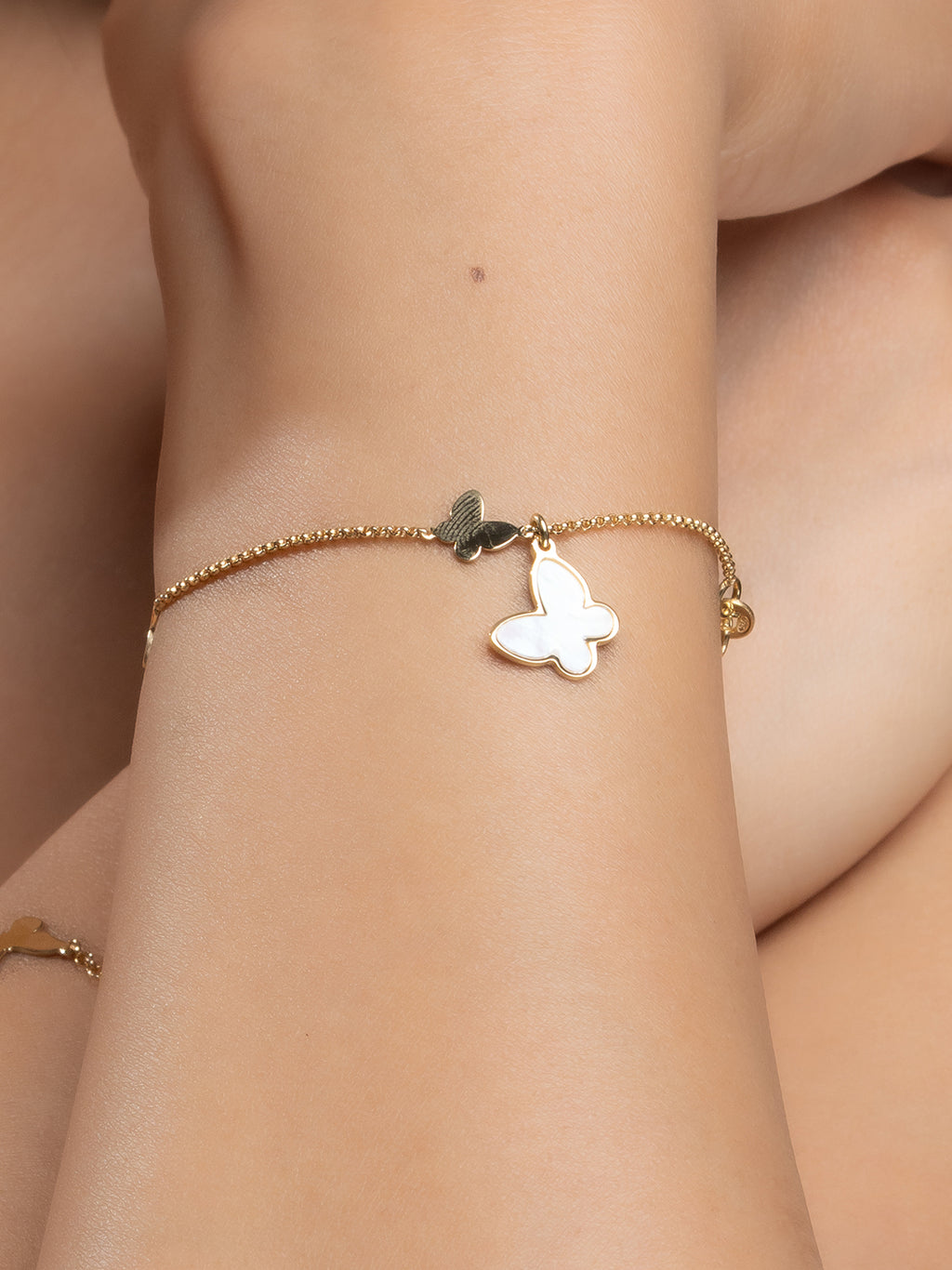 A graceful gold-toned bracelet featuring dual butterfly charms, one with a soft white inlay and the other in a dark gold silhouette. Its delicate beaded chain adds a feminine touch, making it perfect for everyday wear or elegant layering.
