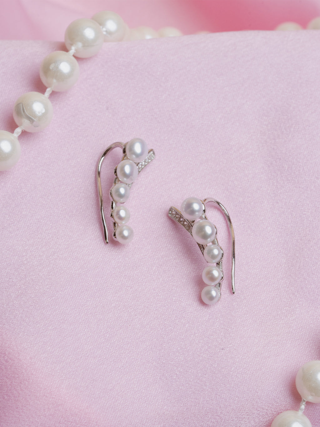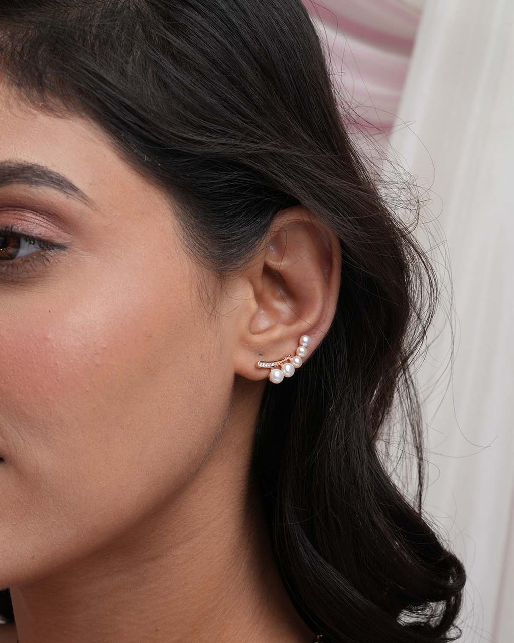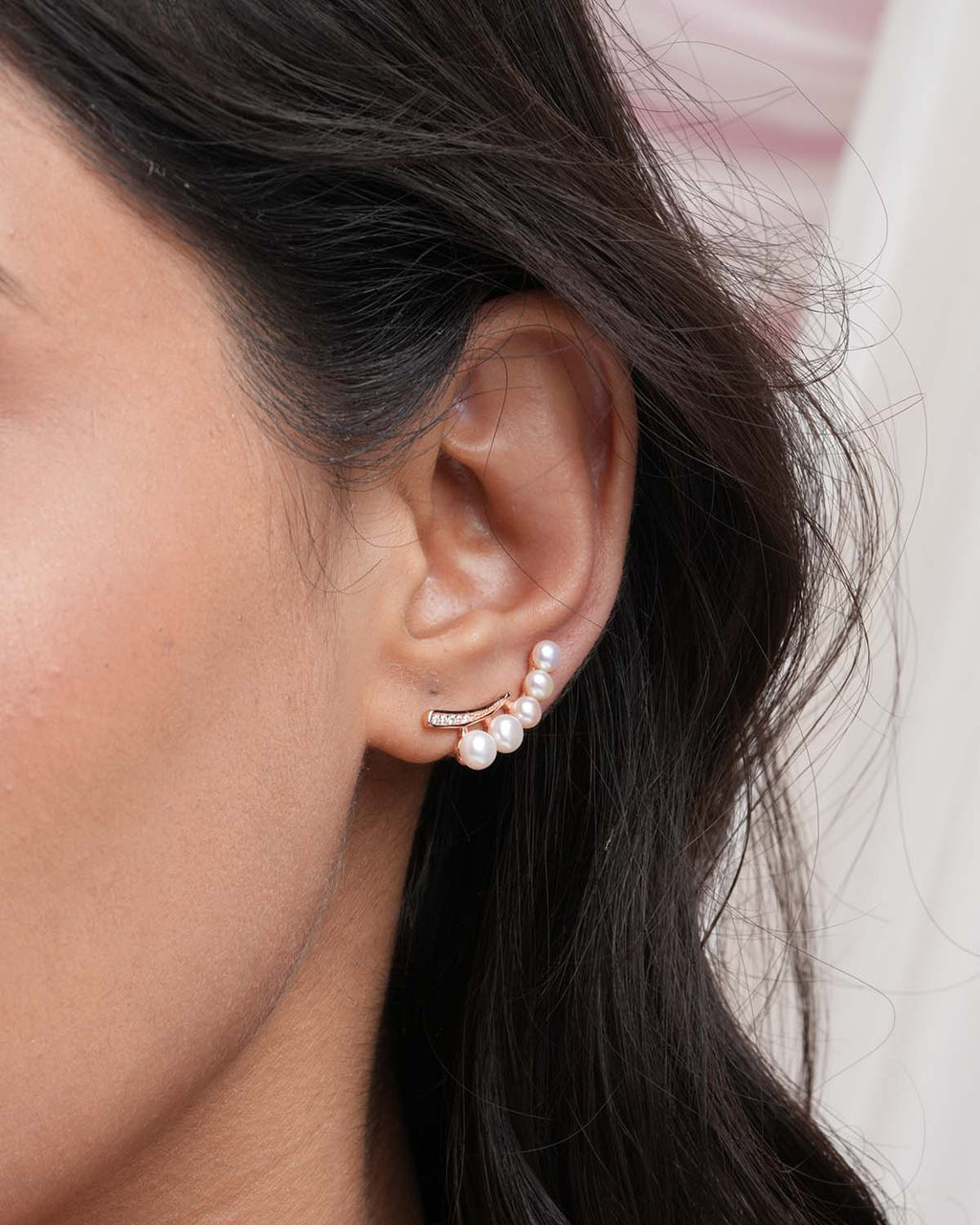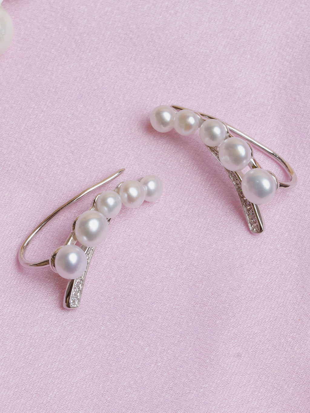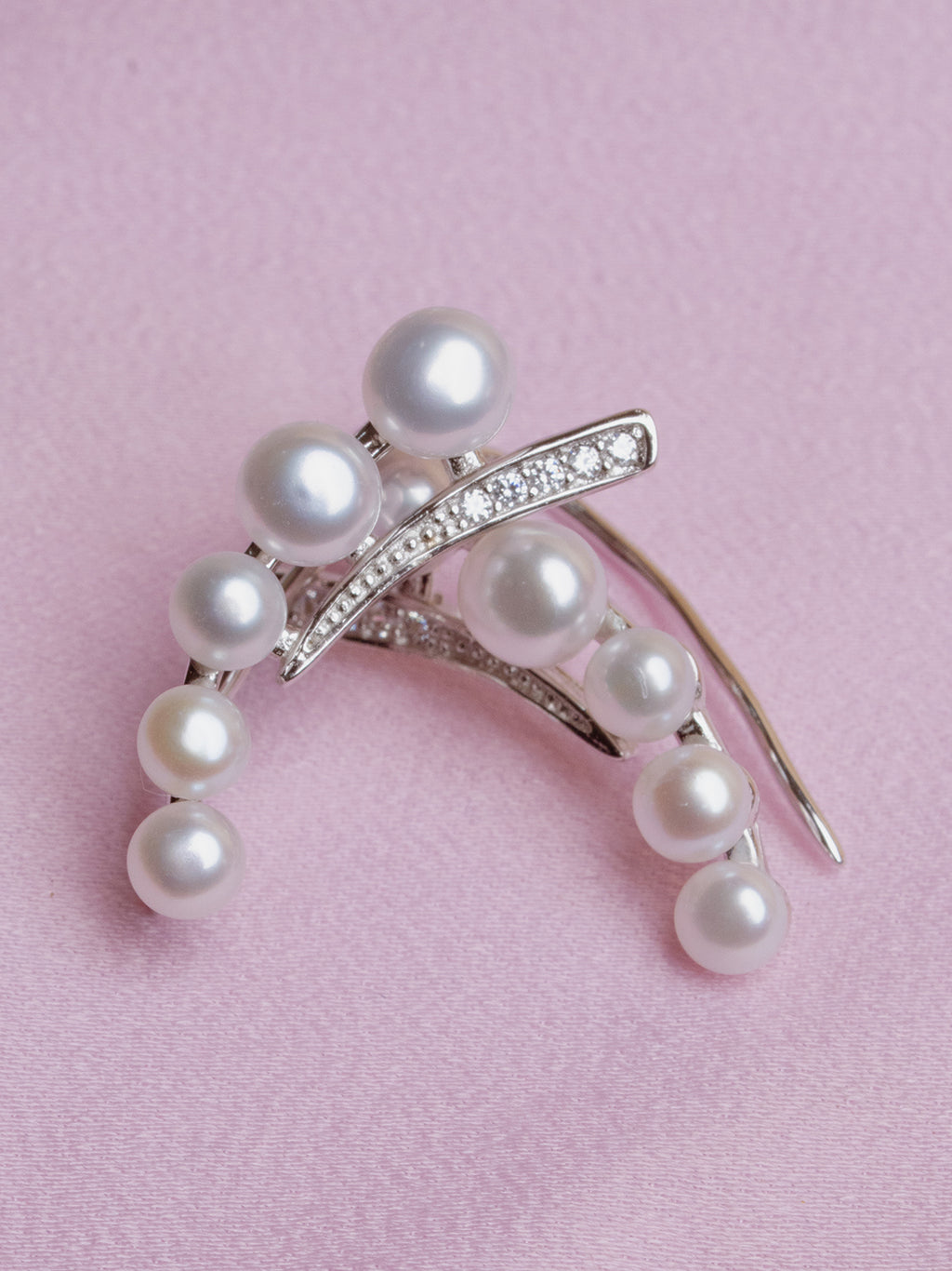 A contemporary ear climber designed in a crescent shape, adorned with lustrous white pearls and sparkling pave-set crystals. This modern, high-fashion piece adds statement glamour without needing multiple piercings.