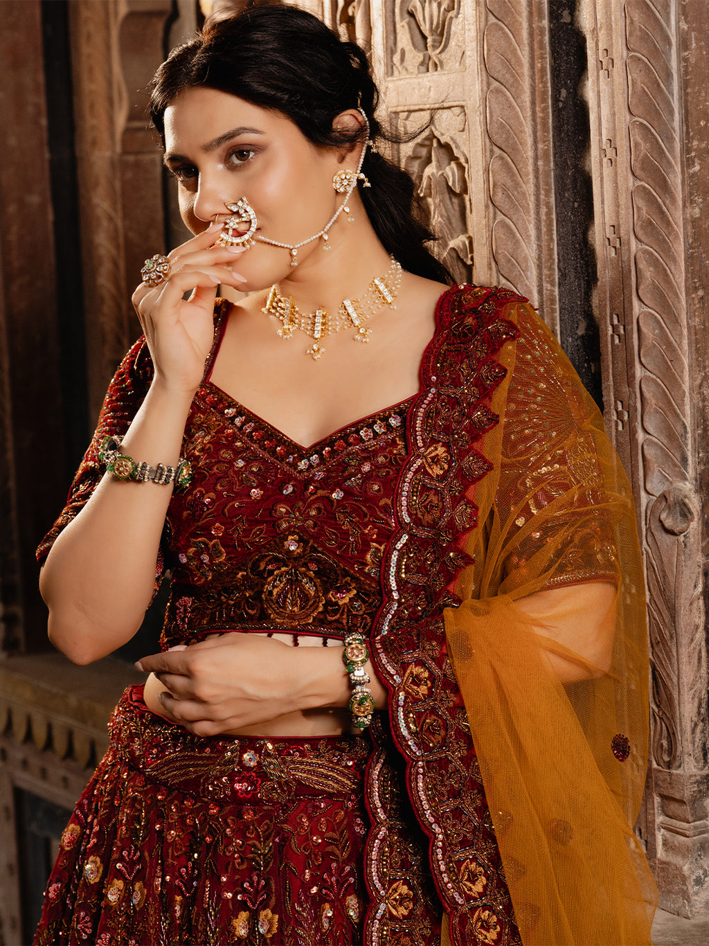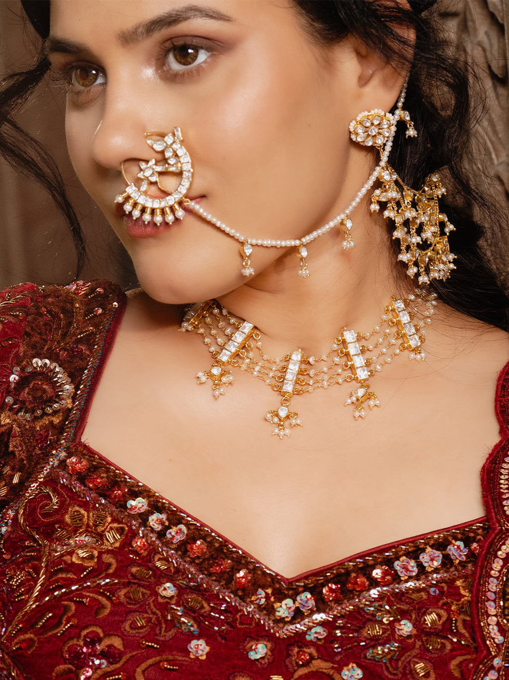 A luxurious non-piercing nose ring featuring a clip-on design for comfort, adorned with sparkling Kundan stones and finished in rich 24K gold polish. Includes a delicate Kundan chain drape for a traditional, elegant look.
