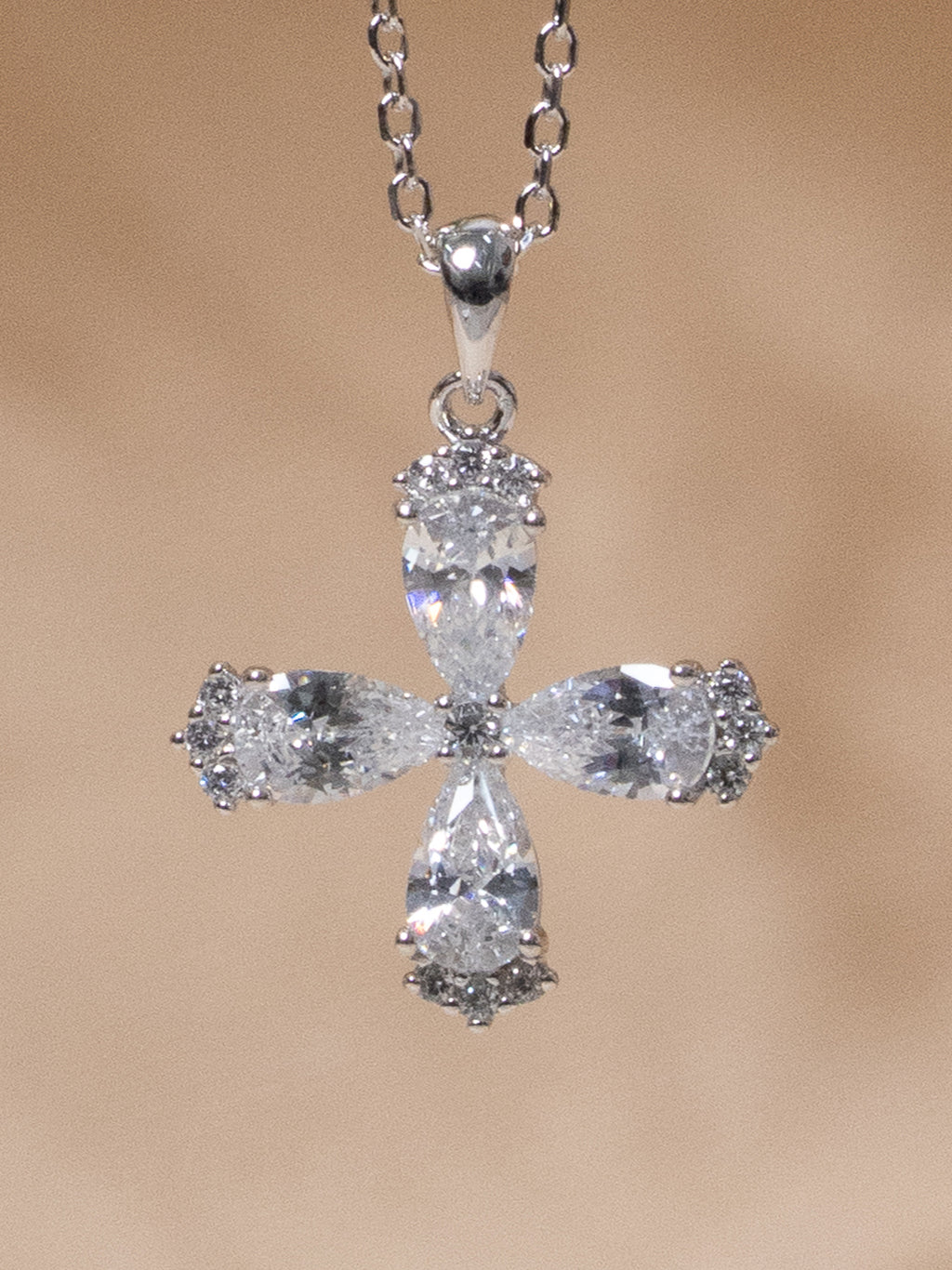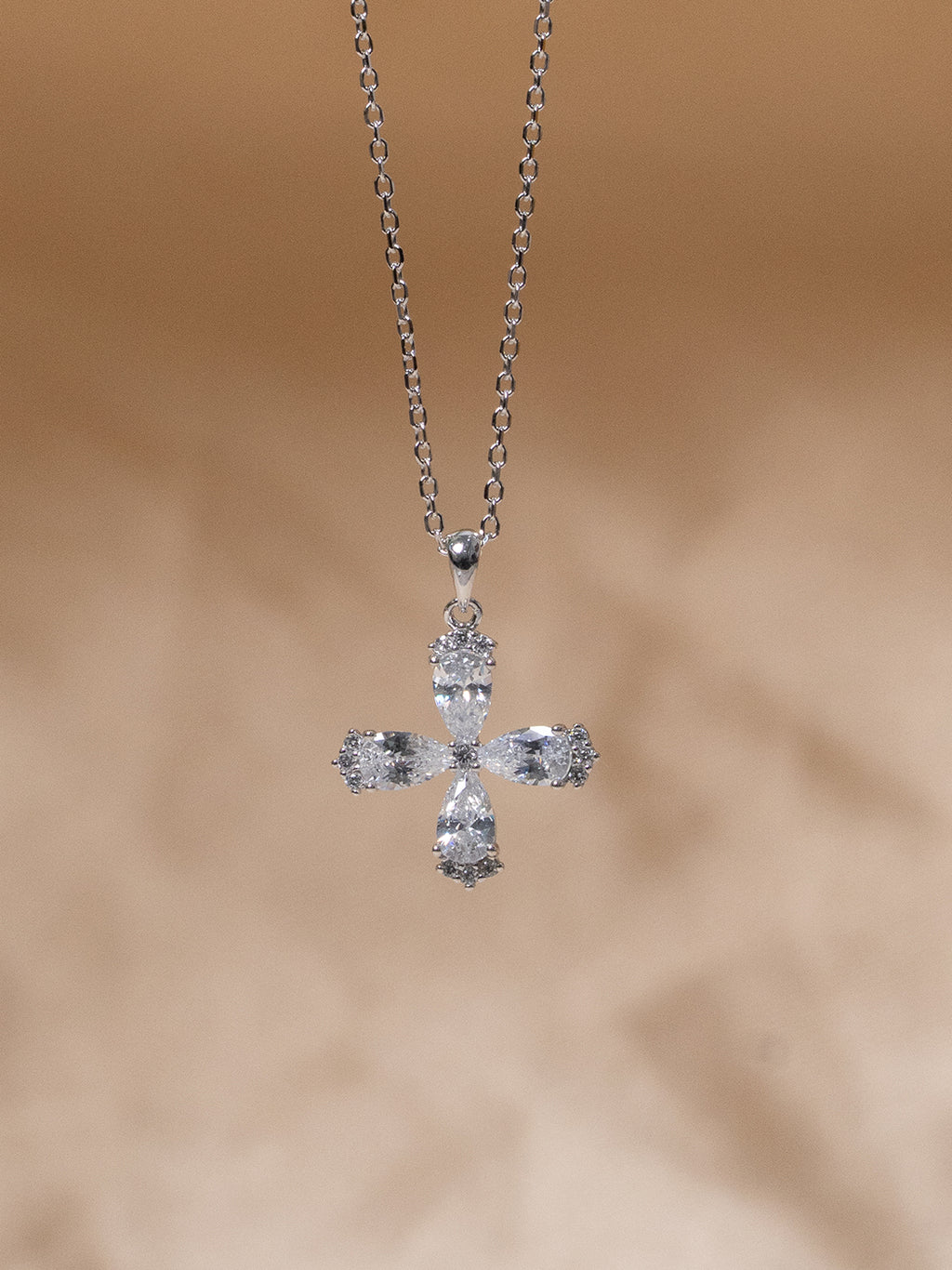 A charming necklace featuring a four-petal clover pendant adorned with brilliant pear-cut CZ stones. Its polished silver-tone finish adds a luxurious shine, making it perfect for everyday elegance or thoughtful gifting.