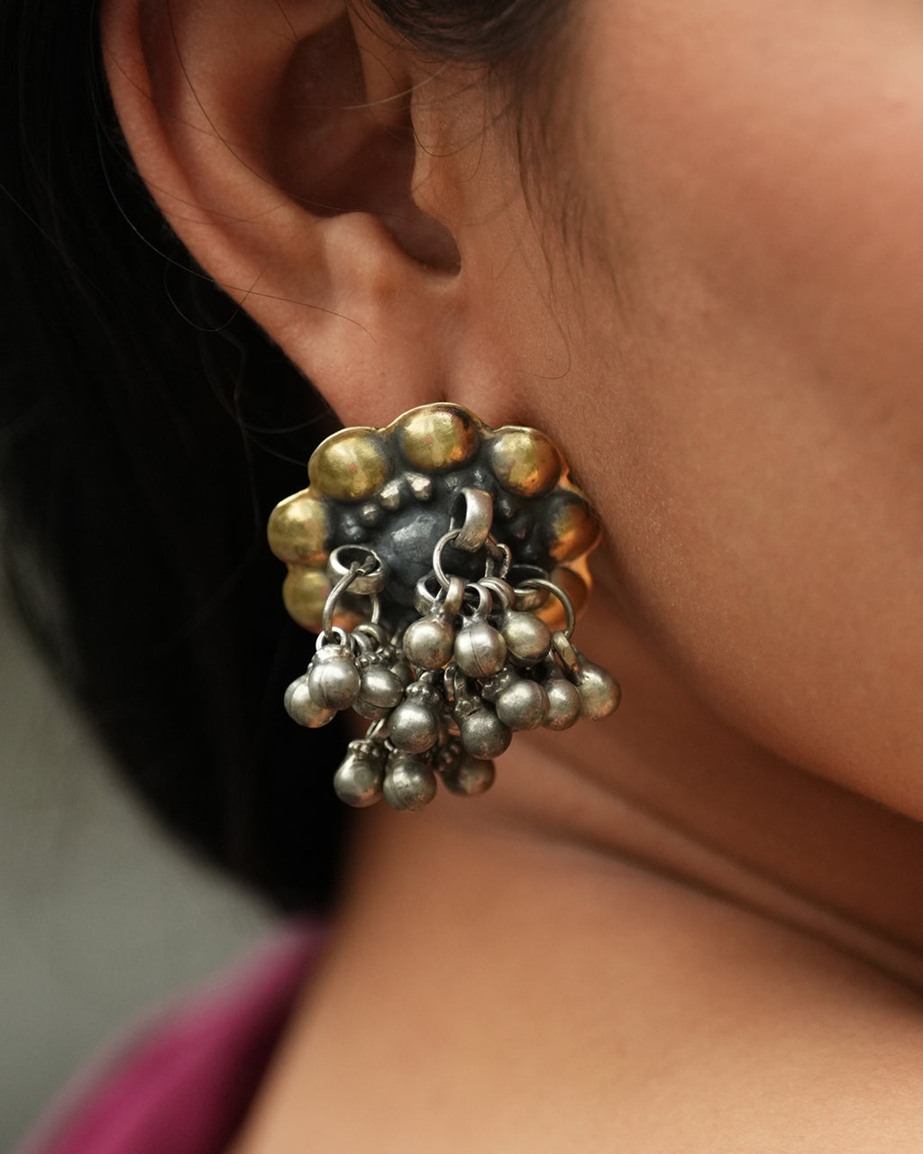 Charming floral stud earrings with a dual-tone oxidized silver and gold/brass finish. Features a cascading cluster of mini ghungroo charms for subtle movement. Free size.