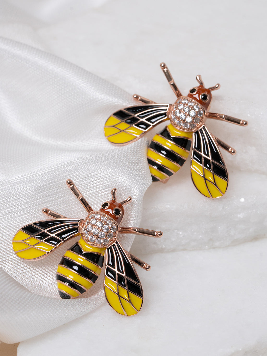 This vibrant bumblebee stud earring captures the perfect mix of playfulness and sophistication. Crafted with glossy black and yellow enamel and set in warm rose gold tone, it shines with pavé-set crystal accents for extra brilliance. The nature-inspired design makes it a standout accessory, adding a fun, stylish touch to any look. Free size ensures a comfortable fit for everyday or occasion wear.