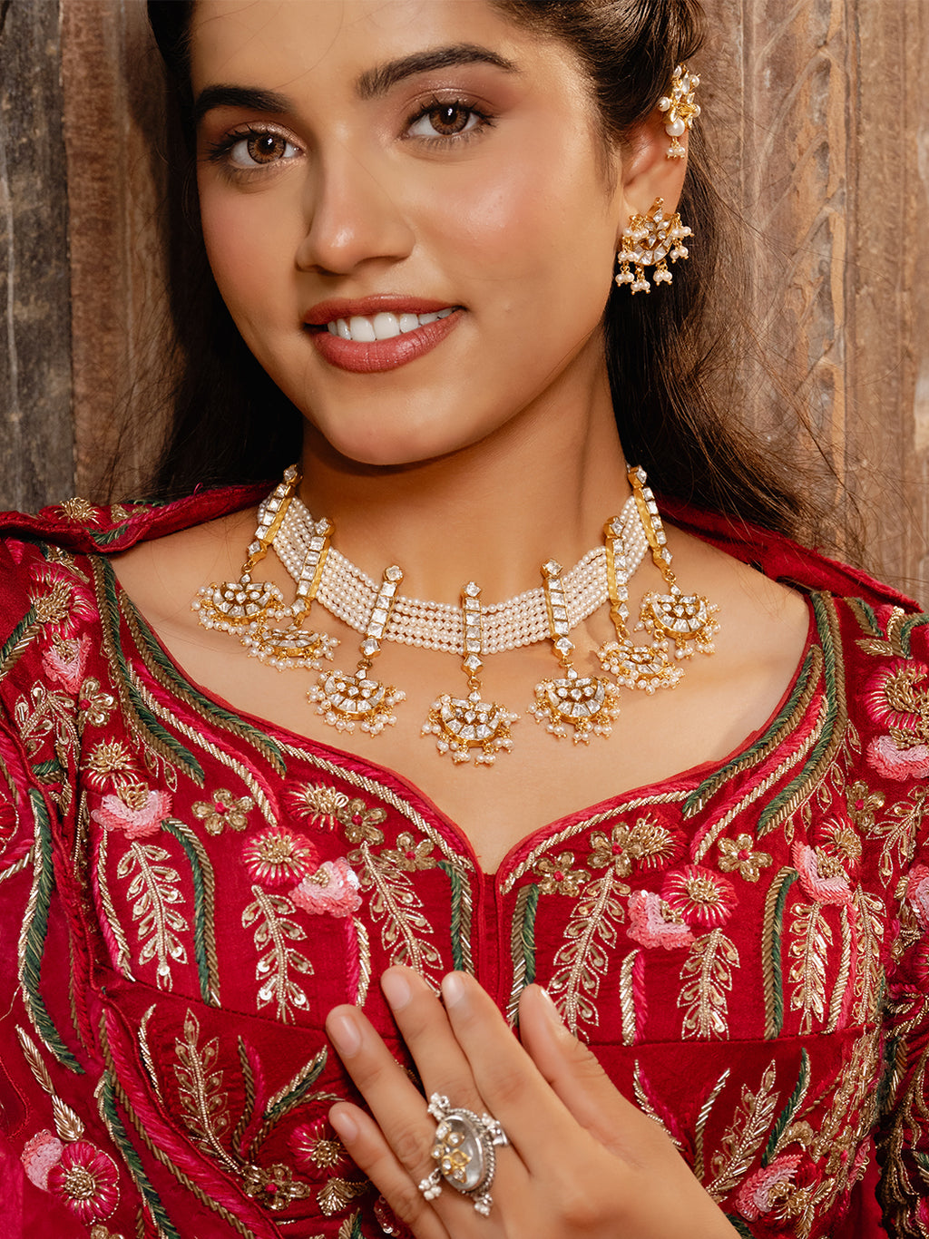Inspired by royal heritage, this exquisite necklace features auspicious elephant motifs crafted with Polki detailing and a radiant gold-dipped finish. The tiered strands of pearls and delicate green and ruby drops add a touch of timeless charm, making it an elegant statement for festive and traditional occasions.