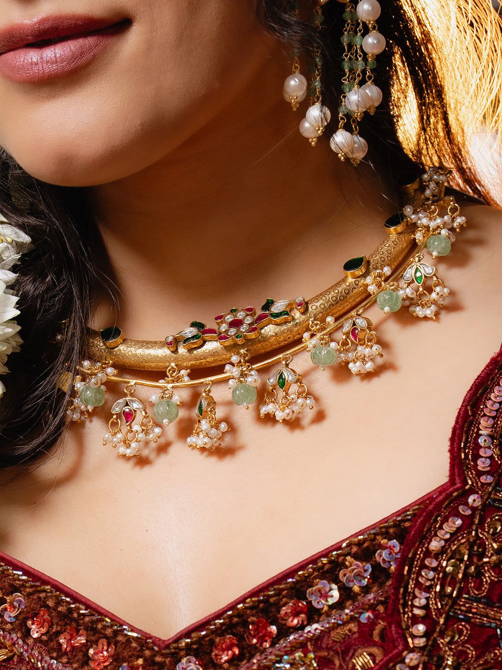 Radiating timeless grandeur, this Hasli-style choker features intricate Kundan craftsmanship set with vibrant stones. The structured neck band, adorned with delicate pearl and green stone drops, reflects classic elegance and regal artistry. Its high-polish gold finish adds a touch of royal brilliance to any festive look.