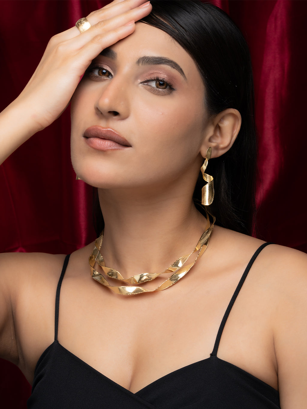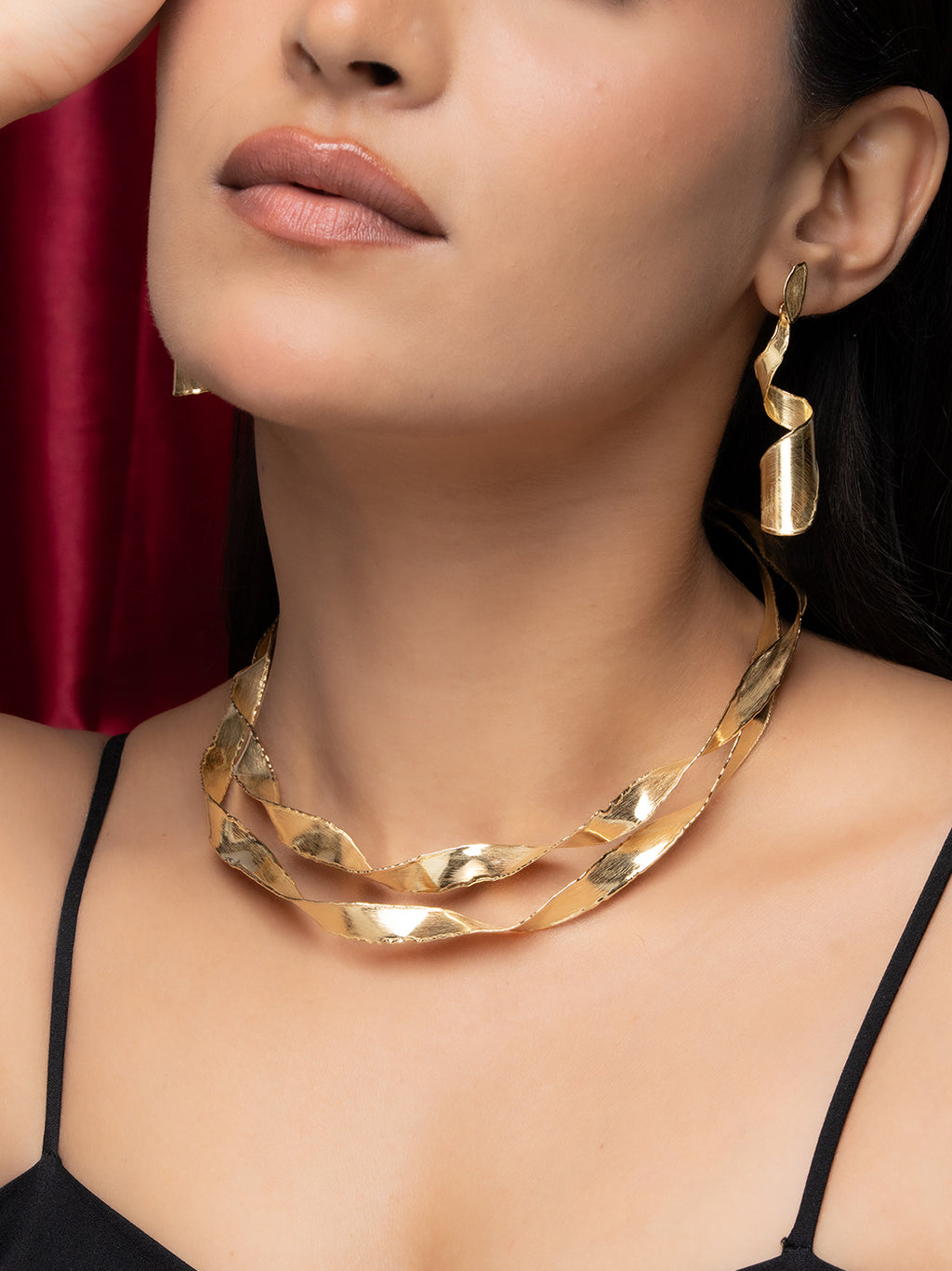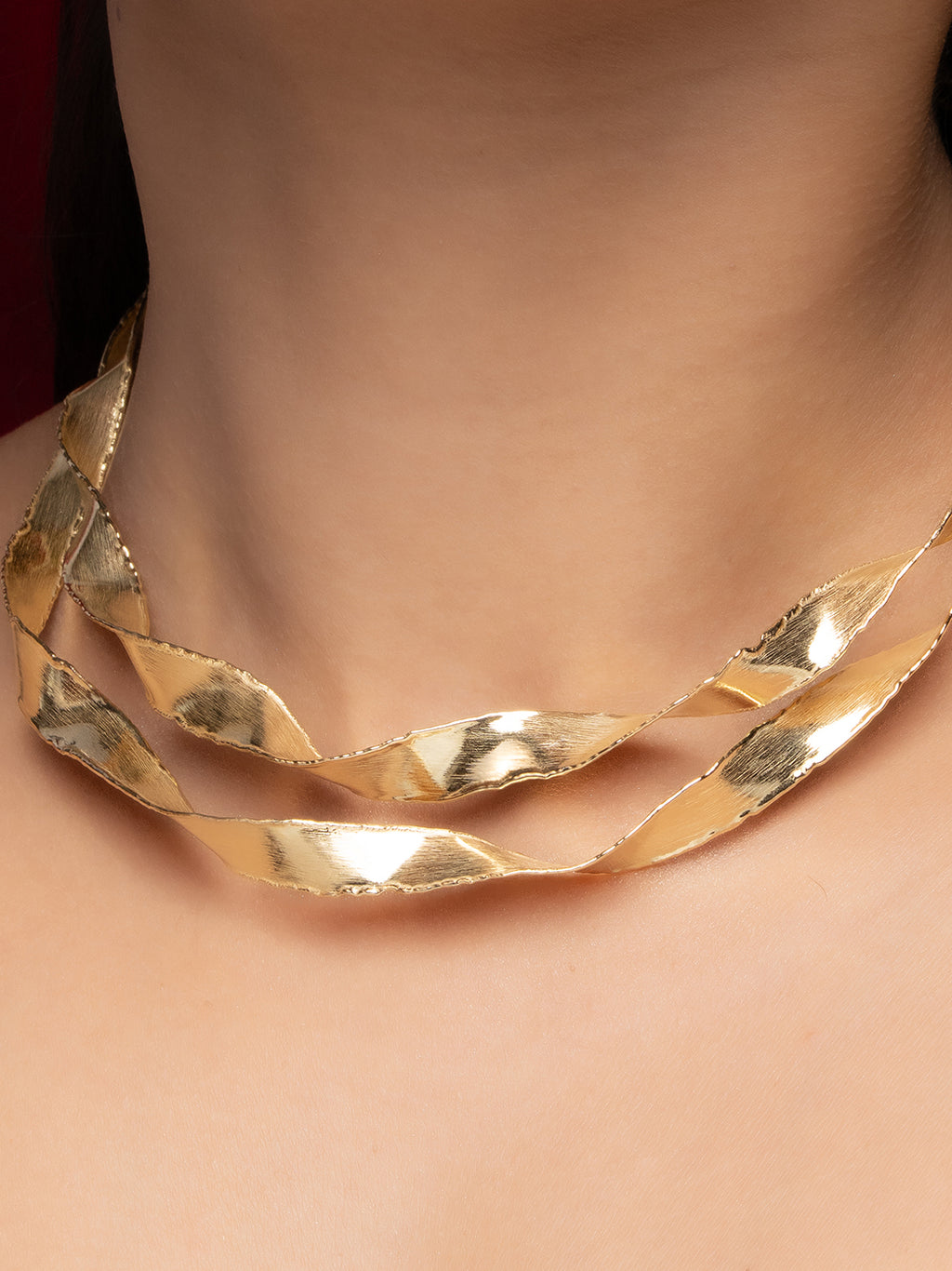 Bold yet graceful, this sculptural necklace showcases a fluid, ribbon-inspired design that sits elegantly on the collarbone. Its twisted, layered structure creates a contemporary statement, blending modern artistry with timeless sophistication. Perfect for elevating evening or festive attire with effortless glamour.