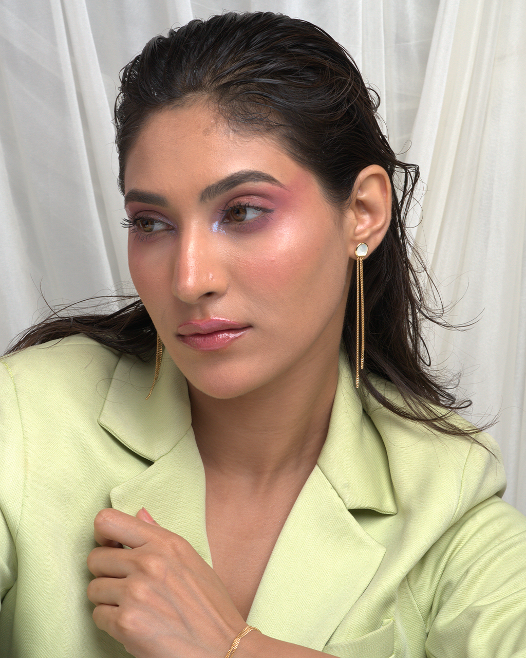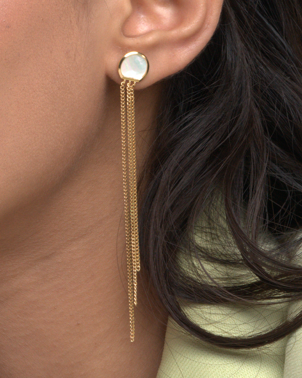 These elegant earrings feature a sleek circular stud paired with fine, elongated chain drops that create a graceful, fluid movement. The minimalist design adds a modern touch while the delicate chains lend effortless sophistication. Perfect for both day and evening wear, they subtly elongate the neckline and enhance any outfit. A refined statement for lovers of understated luxury.