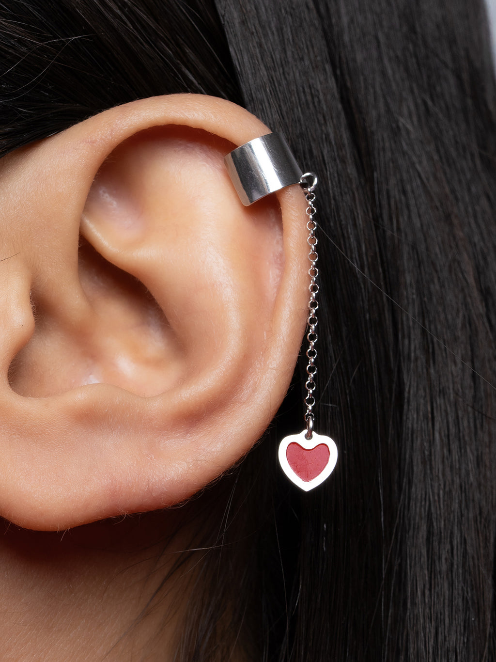 A chic non-pierced ear cuff featuring a smooth silver-tone clip-on design with a delicate chain drop ending in a red heart charm. Perfect for adding a subtle, romantic accent and modern flair without requiring a piercing.