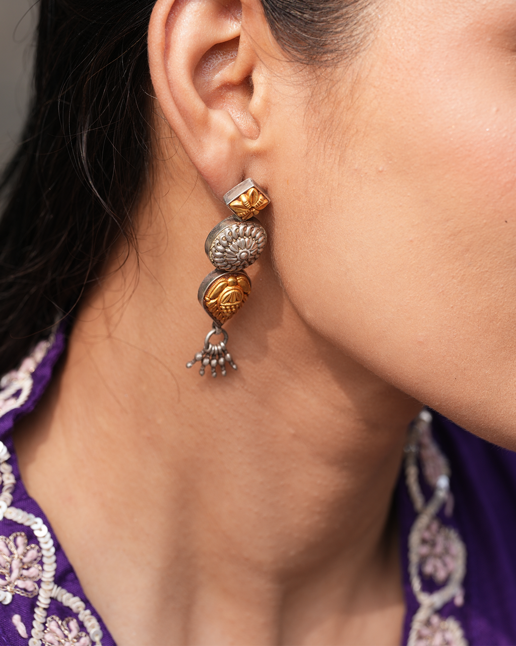 These statement earrings showcase a traditional-inspired design with intricately textured metal elements stacked in a graceful vertical drop. Finished in a harmonious blend of antique gold and oxidized silver tones, they end with delicate ghungroo-style danglers that add gentle movement and charm. Perfect for festive occasions, ethnic wear, or fusion styling, these earrings bring a rich, handcrafted feel to your look.