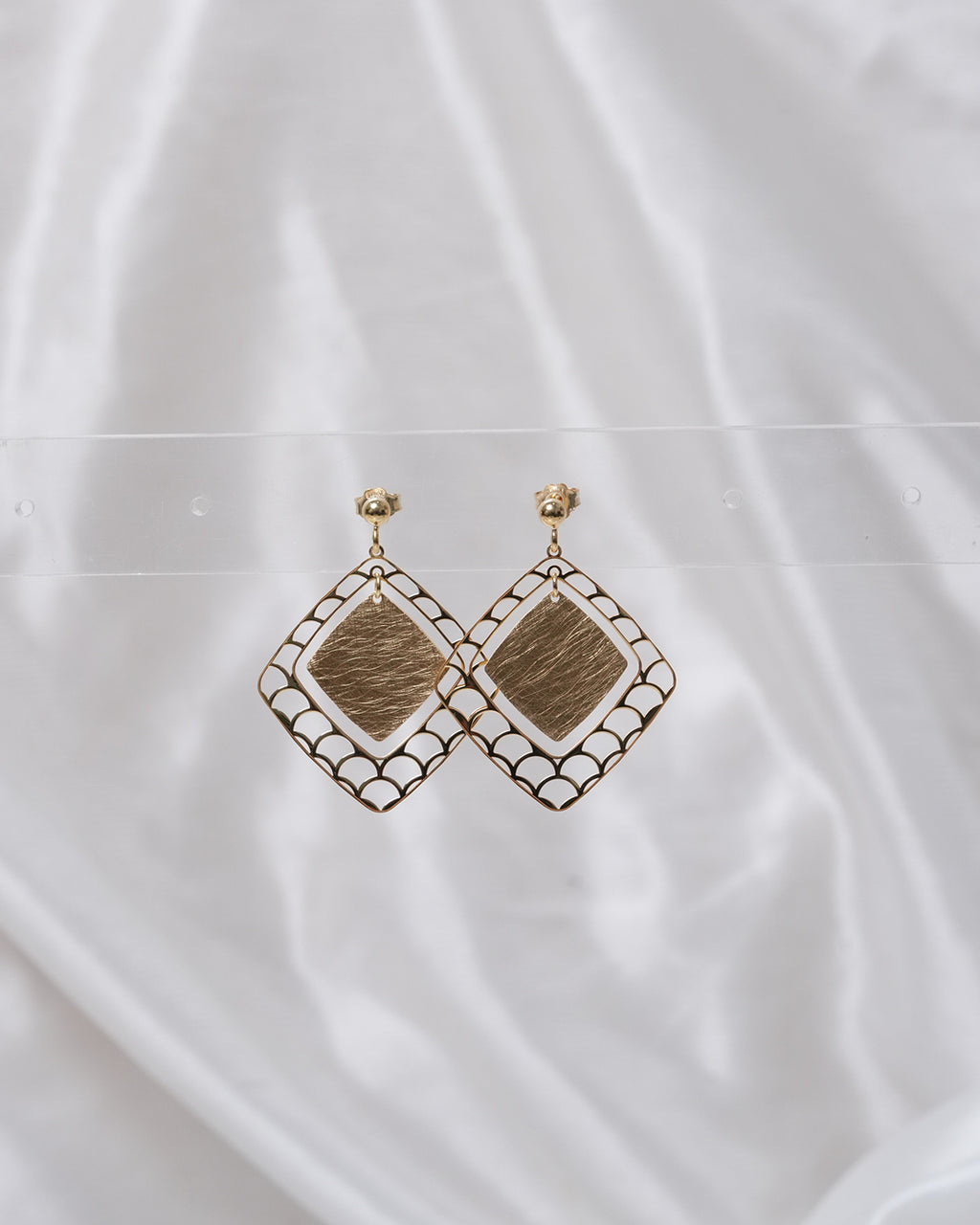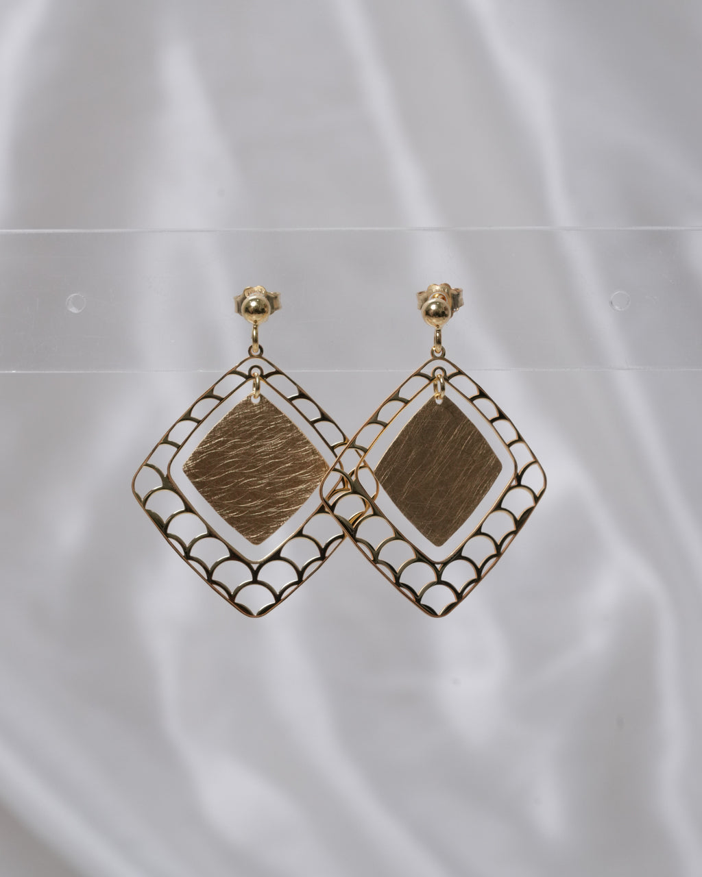 The outer diamond-shaped frame features detailed filigree cutwork, while a brushed inner rhombus adds depth through contrasting texture.