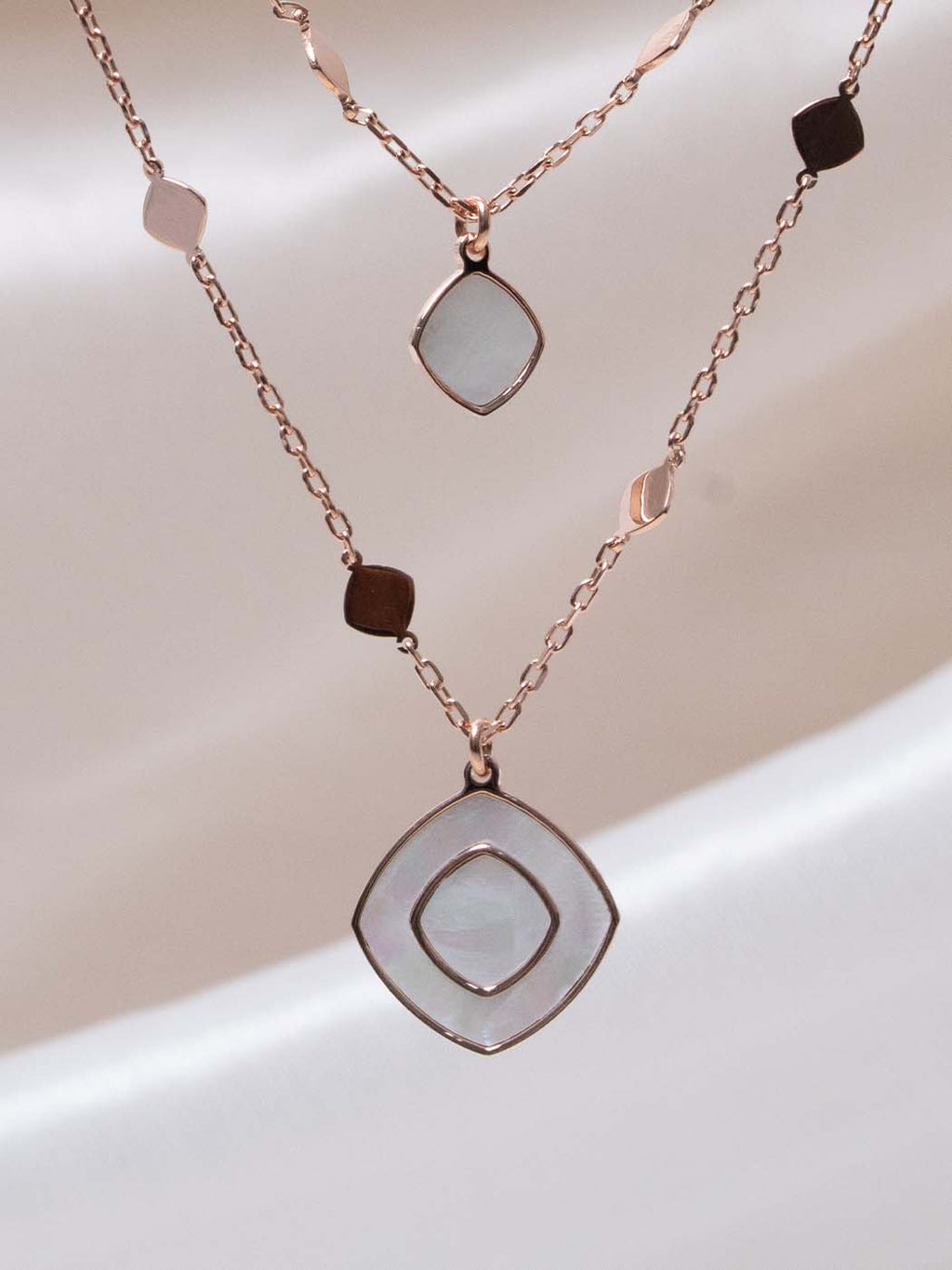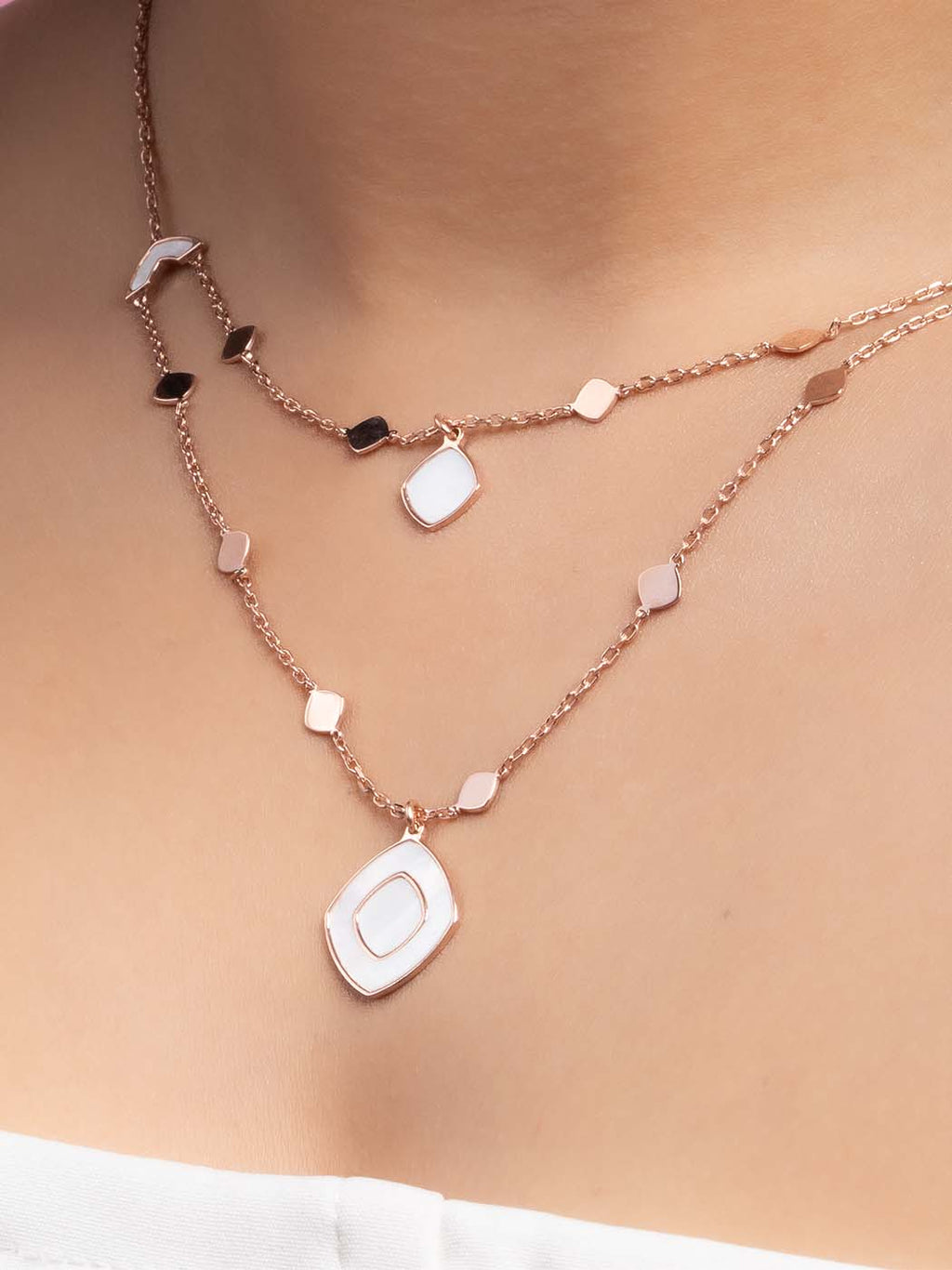 A trendy double-layered chain featuring geometric charms and a striking Mother-of-Pearl pendant. Its rose gold tone and pre-styled design make it a chic, ready-to-wear accessory for any outfit.