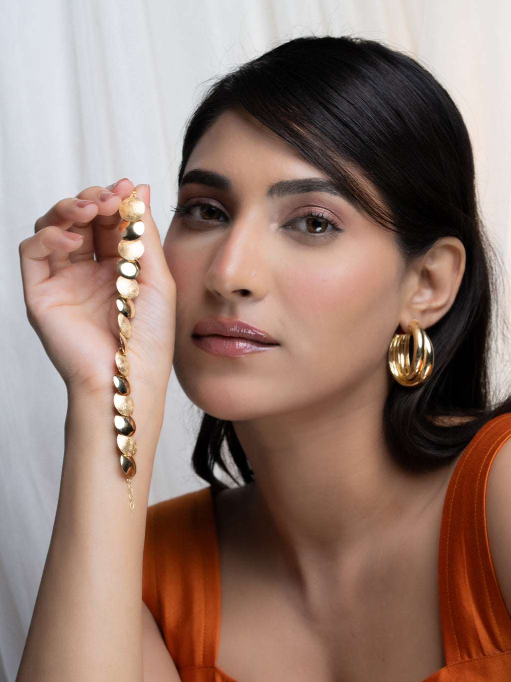 This modern bracelet features a series of polished, circular gold-toned discs with a subtle textured finish, offering both shine and sophistication. Its flexible, linked design ensures a comfortable fit and fluid movement on the wrist. The bracelet comes in a free-size fit, perfect for everyday wear or effortless layering.