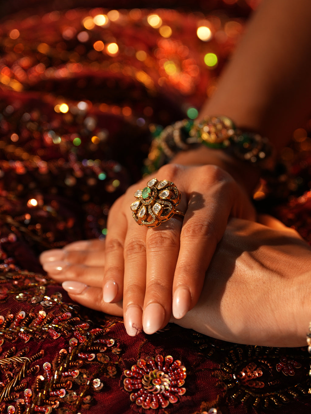 A striking statement ring featuring a floral cluster design with Kundan-style petals and a central oval green stone. Crafted in antiqued gold-tone pure silver, it exudes traditional elegance and timeless charm.