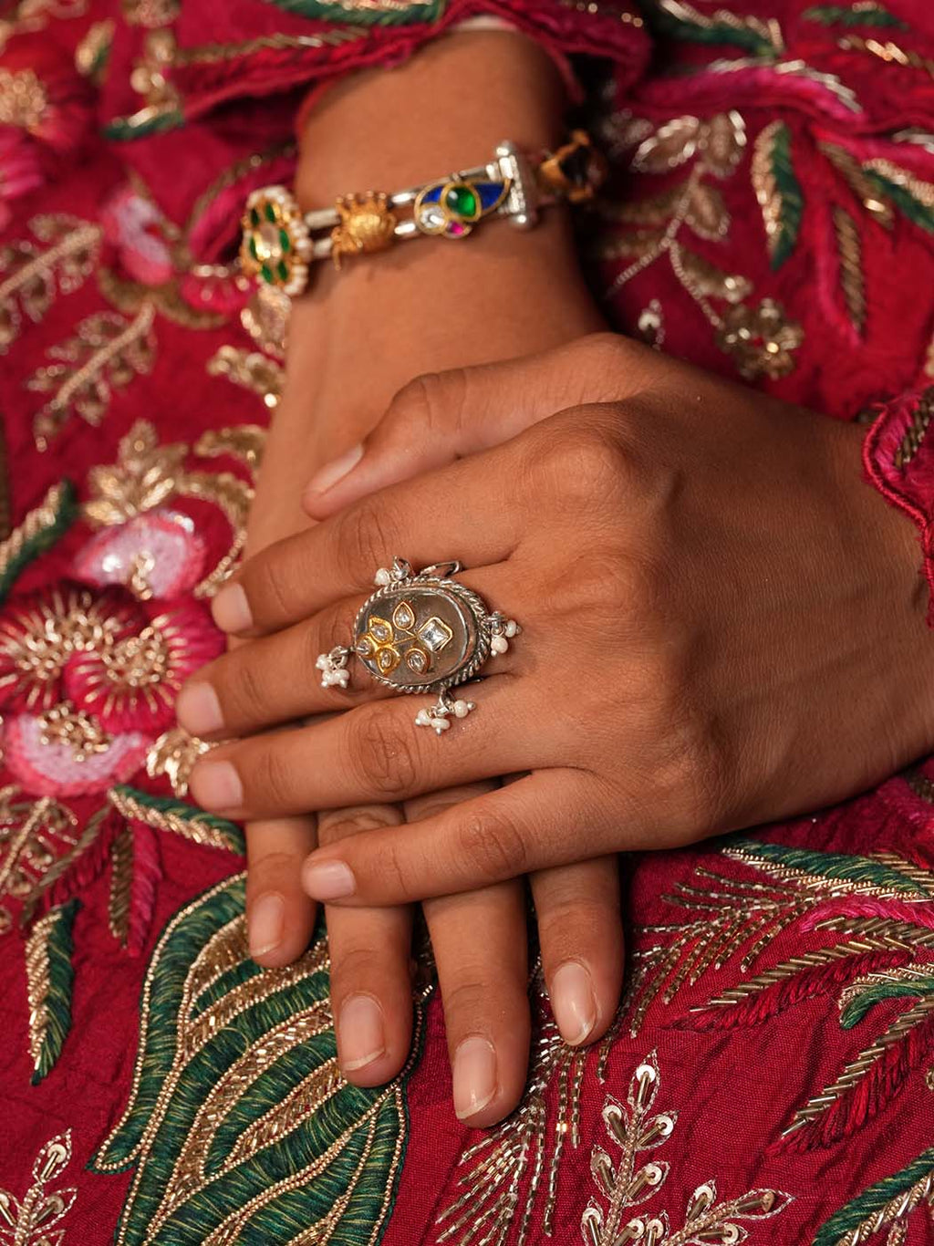 An adjustable statement ring featuring an intricate oval setting adorned with Kundan stones, pearl drops, and colorful Meenakari accents. Crafted in antiqued silver-tone pure silver, it blends traditional charm with versatile wear.