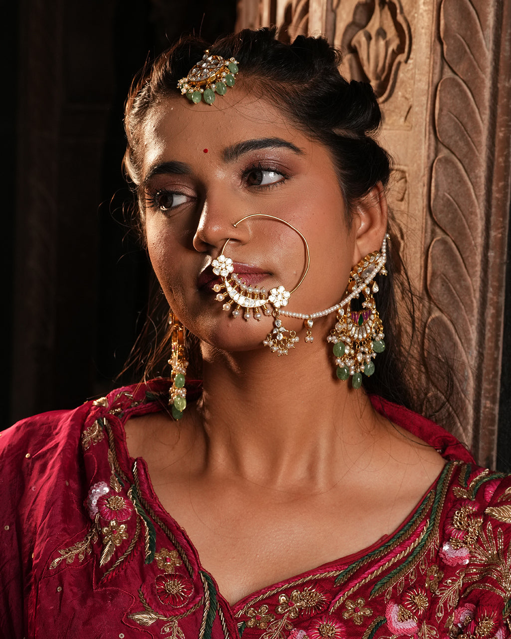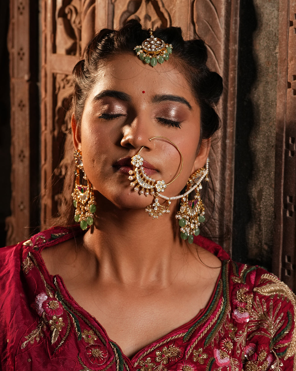 A regal jewelry set featuring elaborate multi-tiered chandelier earrings and a coordinating maang tikka. Adorned with shimmering Kundan stones and mint green drops, the pieces are finished in rich 24K gold polish for a traditional, elegant look perfect for festive or bridal occasions.