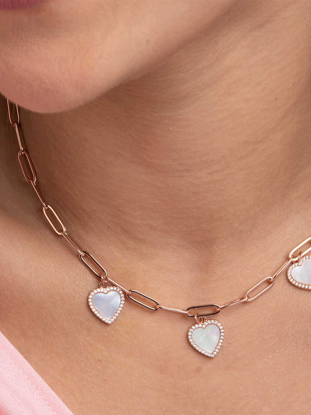 A charming blend of trend and romance, this chain features a sleek paperclip link design adorned with delicate heart-shaped charms. Each charm glows with an iridescent Mother-of-Pearl inlay surrounded by sparkling stones, adding just the right amount of shimmer. The warm rose gold-tone metal enhances its soft, feminine appeal, making it perfect for everyday wear or a special date night look.