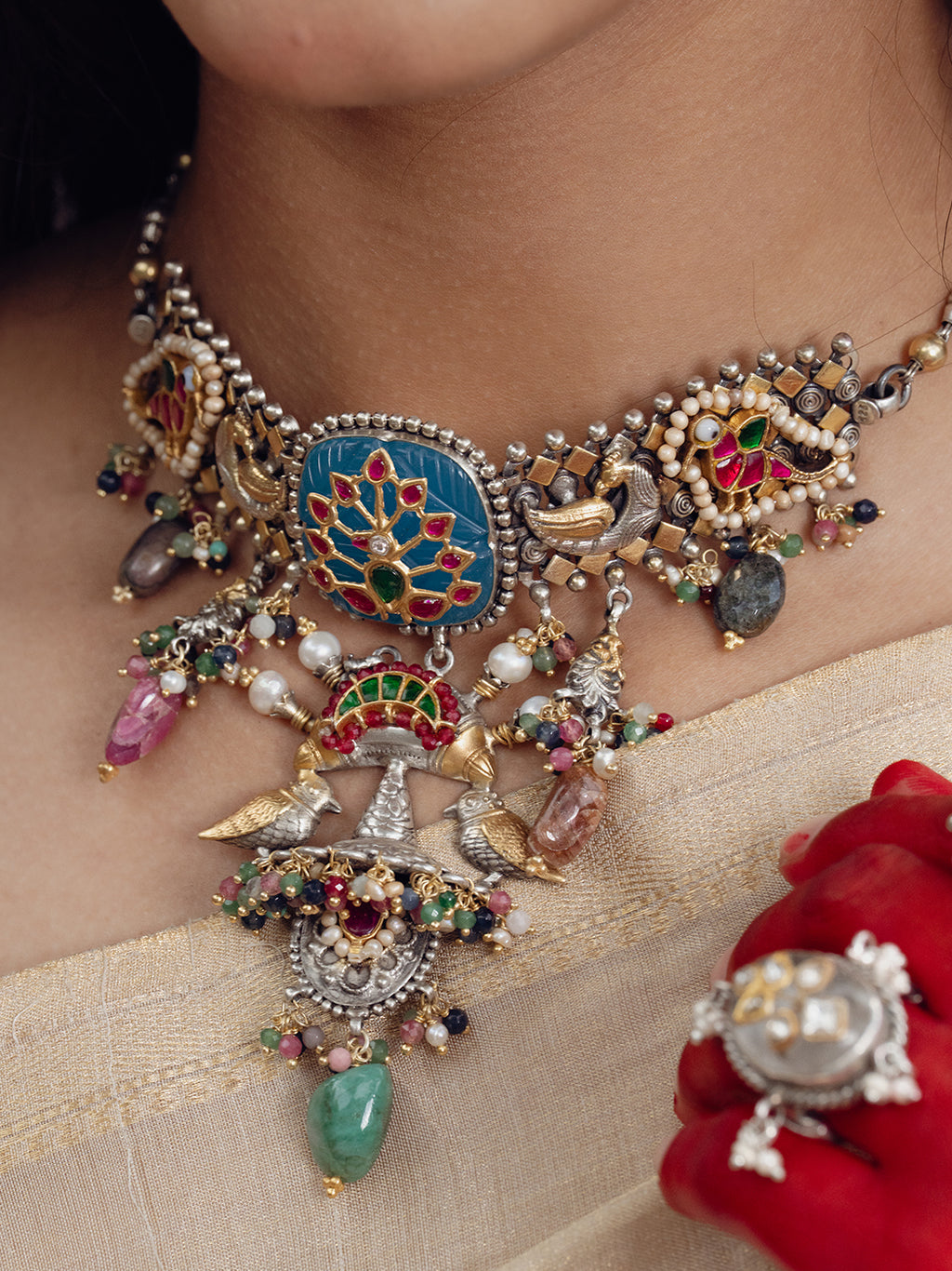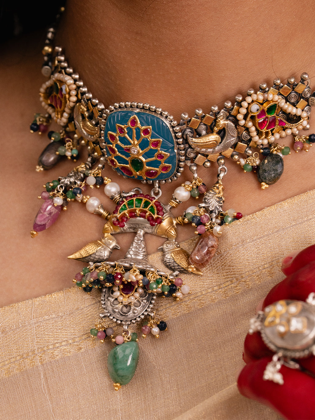 A true blend of tradition and artistry, this dual-tone choker features oxidized silver with subtle gold accents for a vintage charm. Detailed with vibrant enamel work and intricate motifs, it captures timeless elegance. The colorful gemstone and pearl drops add a graceful touch, perfect for elevating festive and special occasion looks.