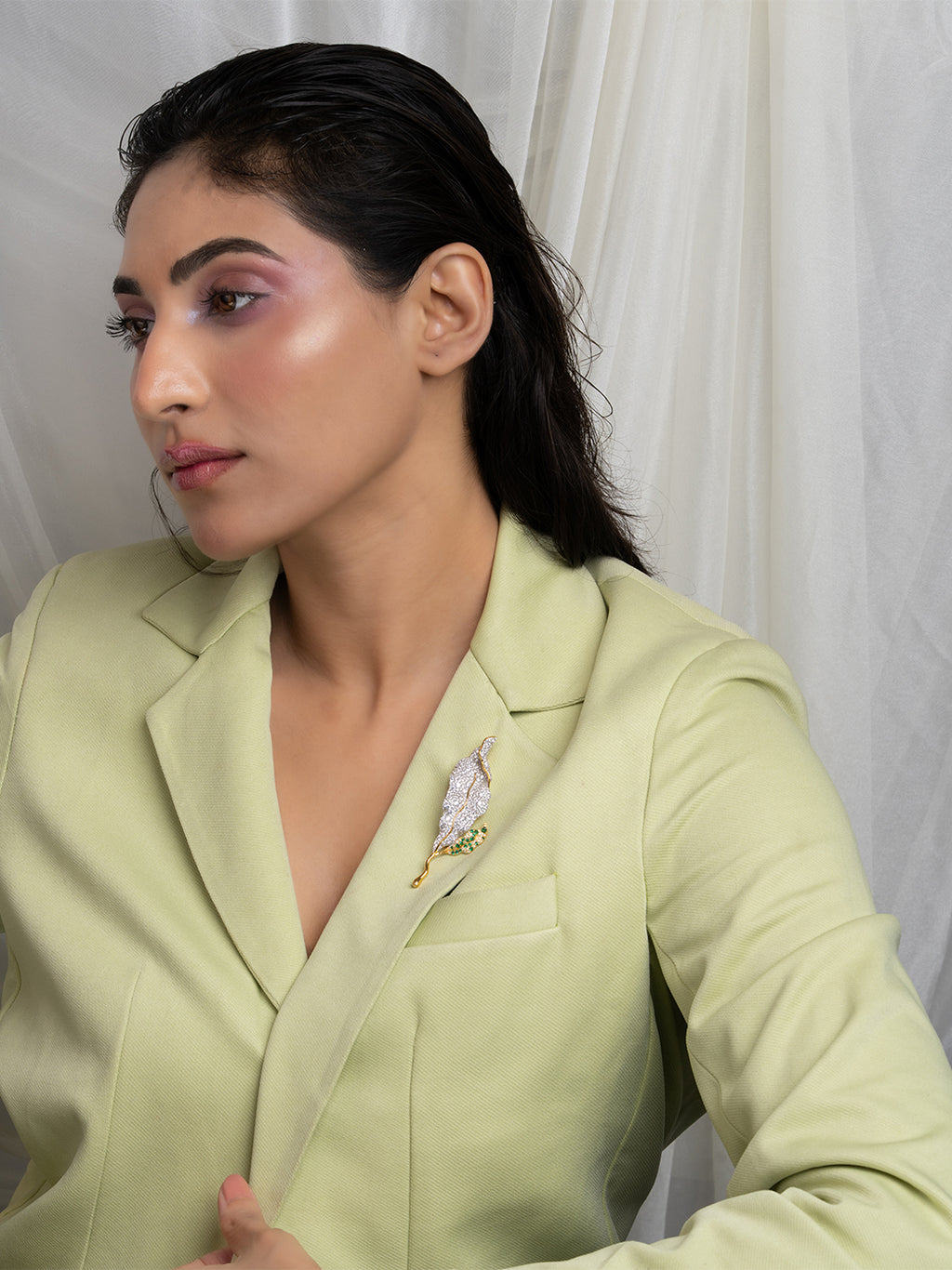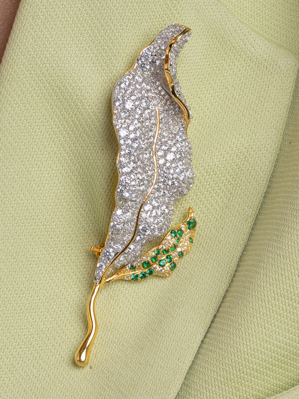 This elegant brooch features an elongated leaf design adorned with pavé-set clear stones and a subtle green accent at the base. The dual-tone finish blends silver brilliance with a polished gold stem, creating a refined and versatile accessory. Free size, suitable for sarees, blazers, or scarves.