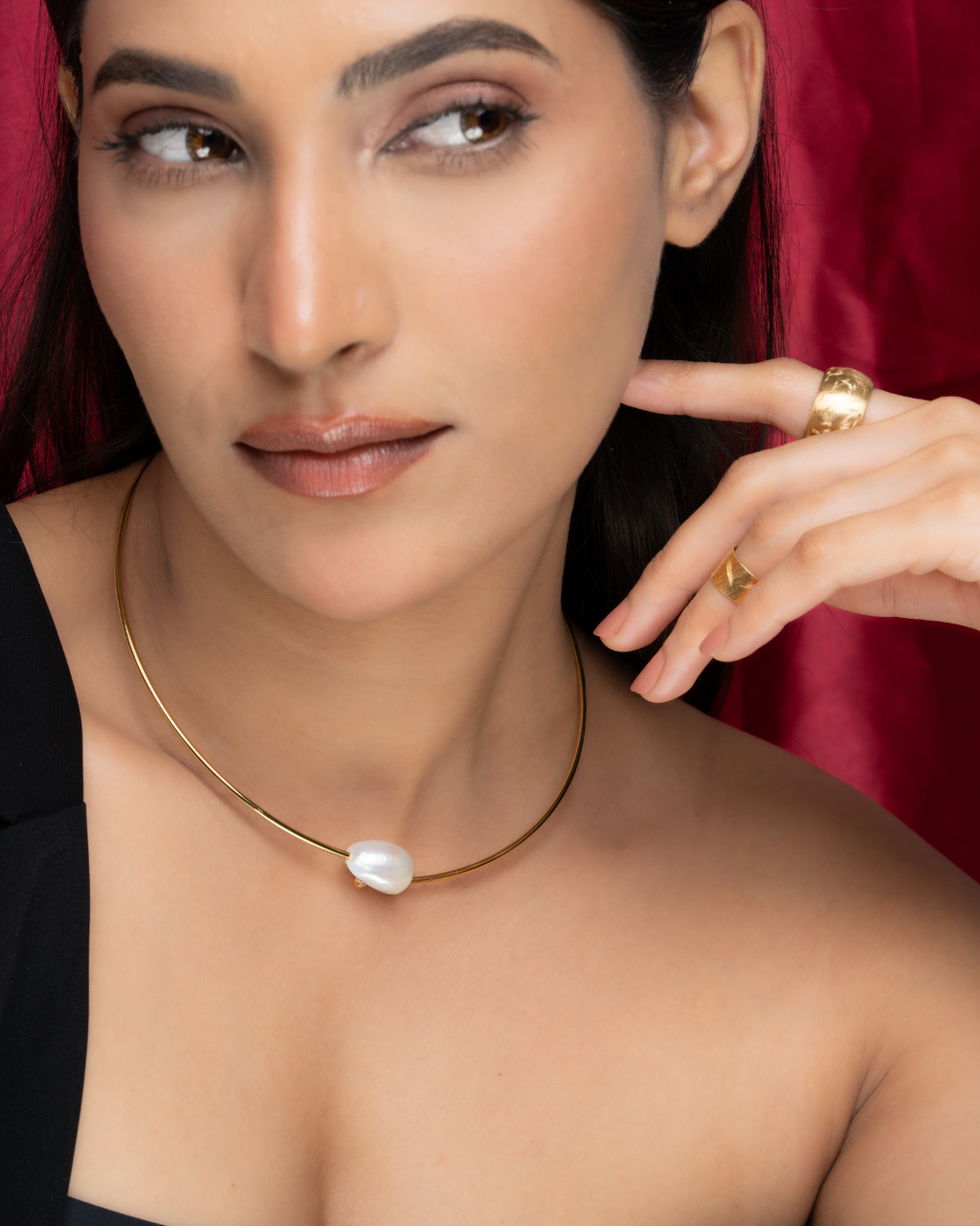 A sleek, minimalist gold-tone choker featuring a single freshwater pearl at the center for an elegant and timeless look. Its lightweight design and secure clasp make it ideal for both everyday wear and special occasions.
