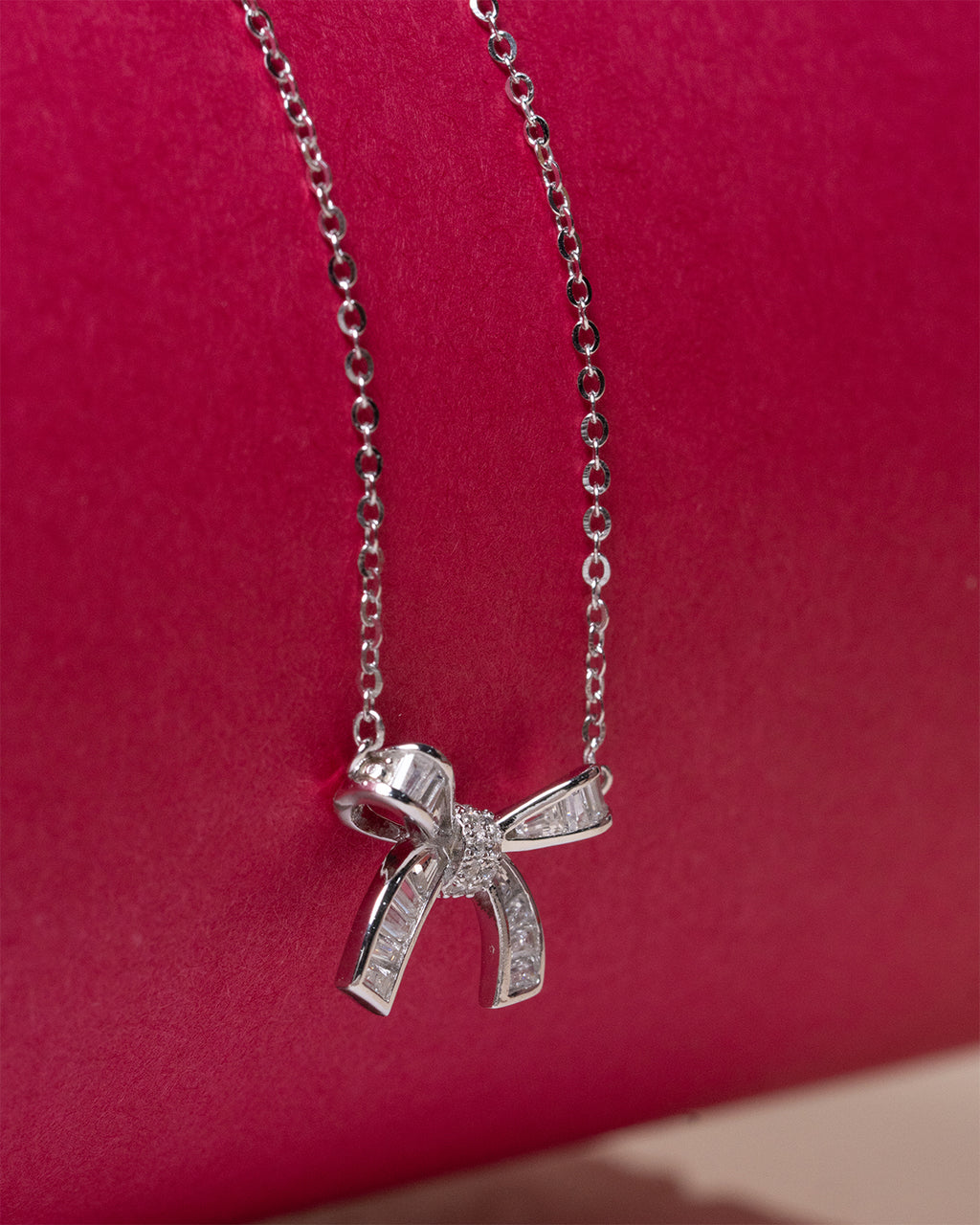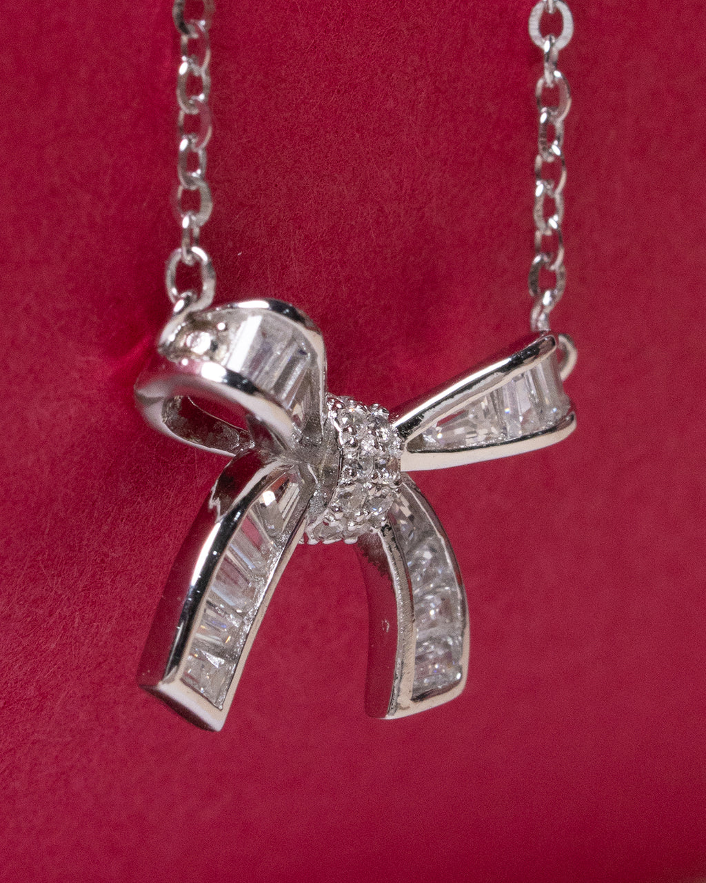 The bow is detailed with subtle baguette-cut stones, adding a refined sparkle.