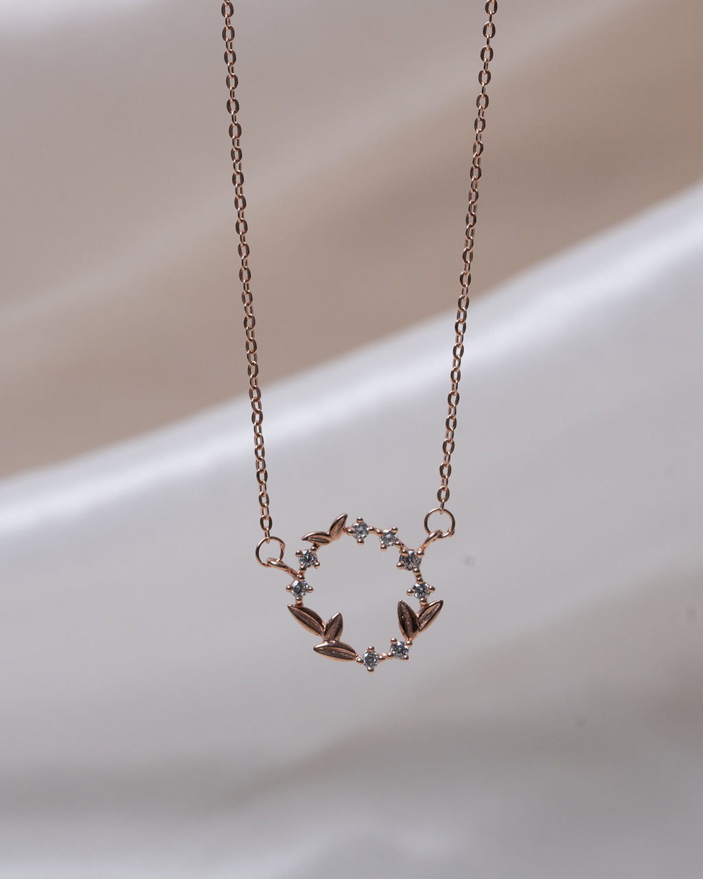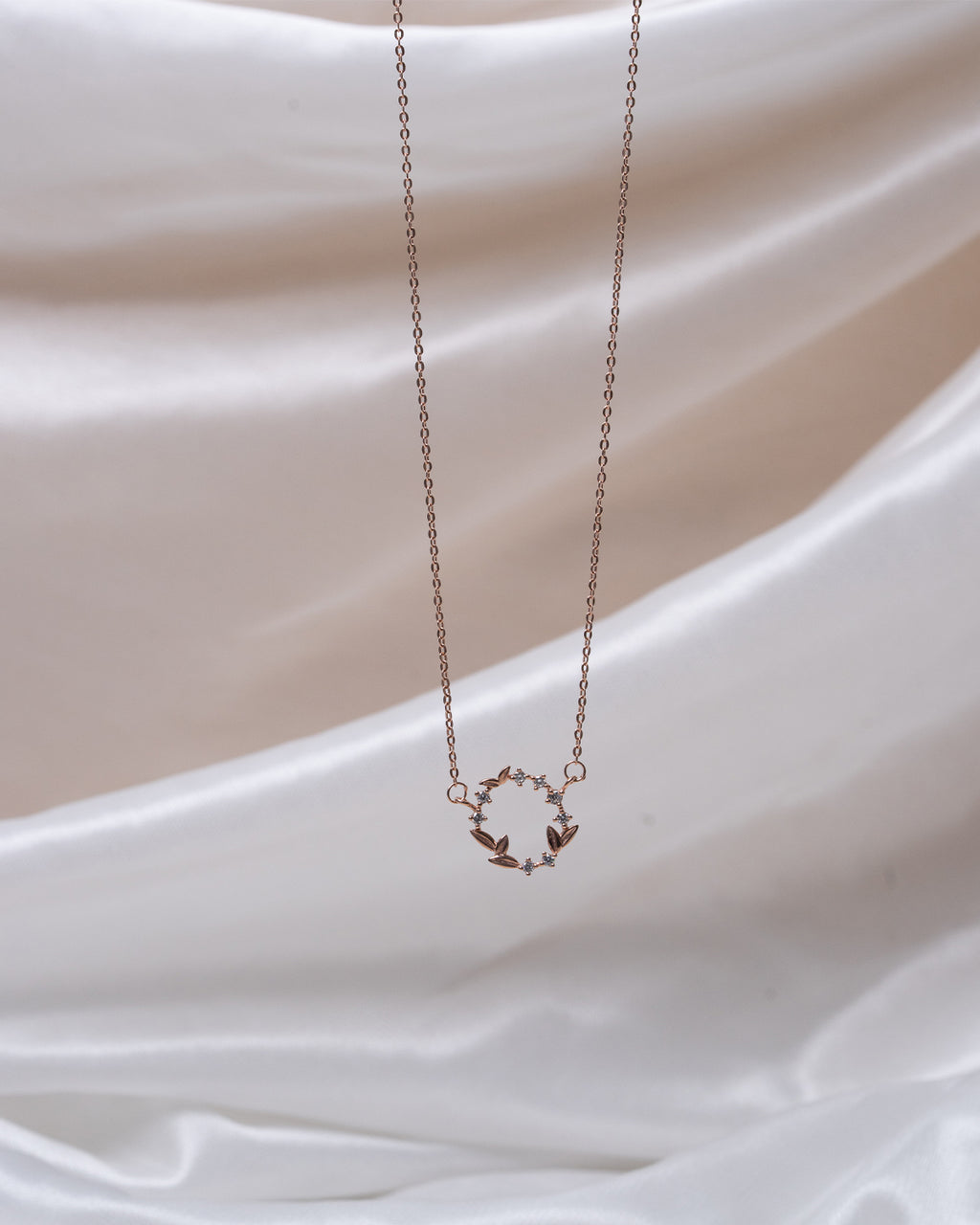 A beautifully feminine necklace featuring a delicate wreath pendant crafted with alternating rose gold leaves and sparkling CZ accents. Symbolizing harmony and eternal beauty, this graceful piece adds timeless charm to both everyday and special occasions.