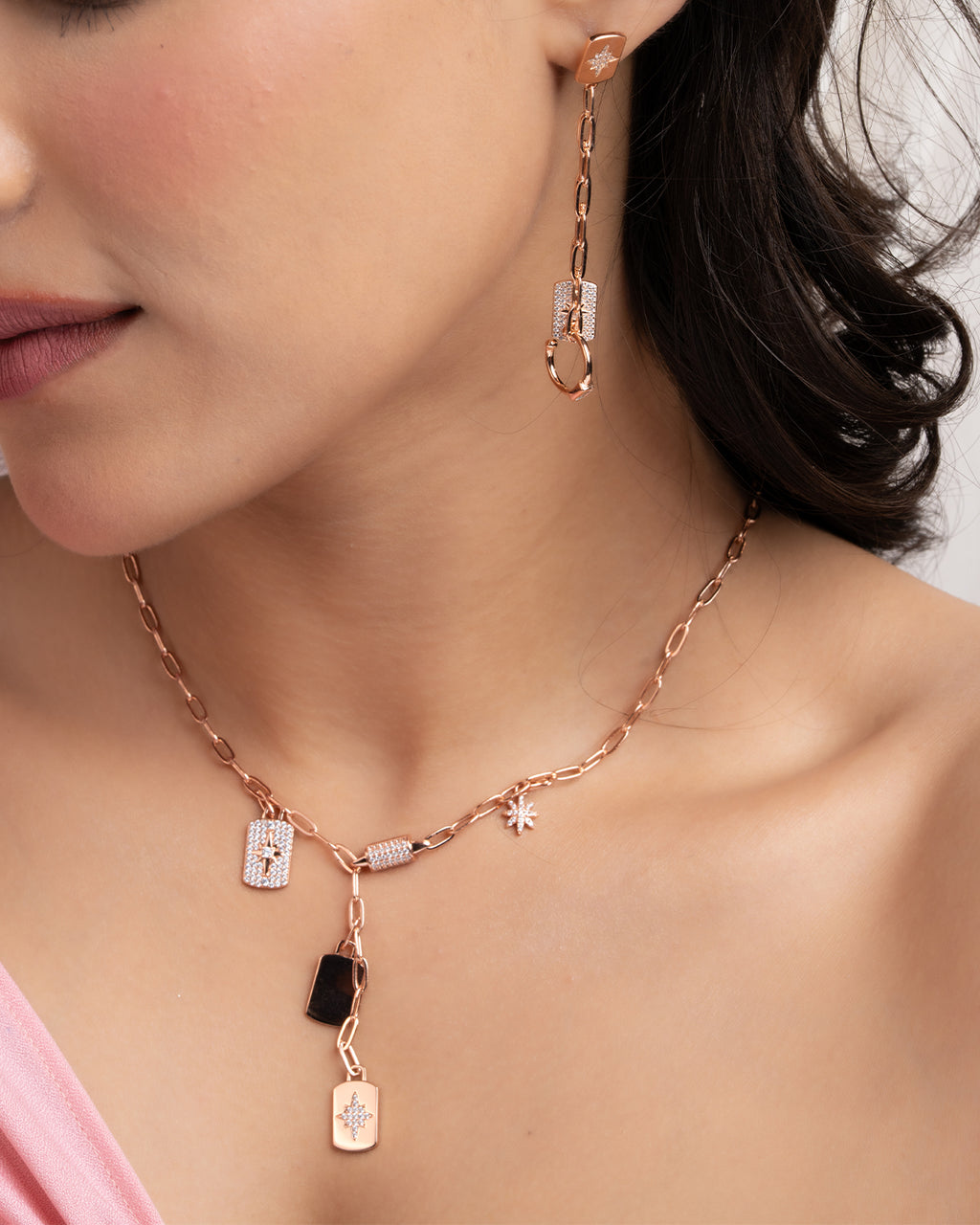 Modern and chic, this statement set pairs a chunky paperclip chain with an assortment of sparkling micro-pavé charms. Each charm, from stars to lockets adds a playful yet elegant touch to the rose gold finish. The matching drop earrings complete the look, making it a perfect blend of trend and sophistication.