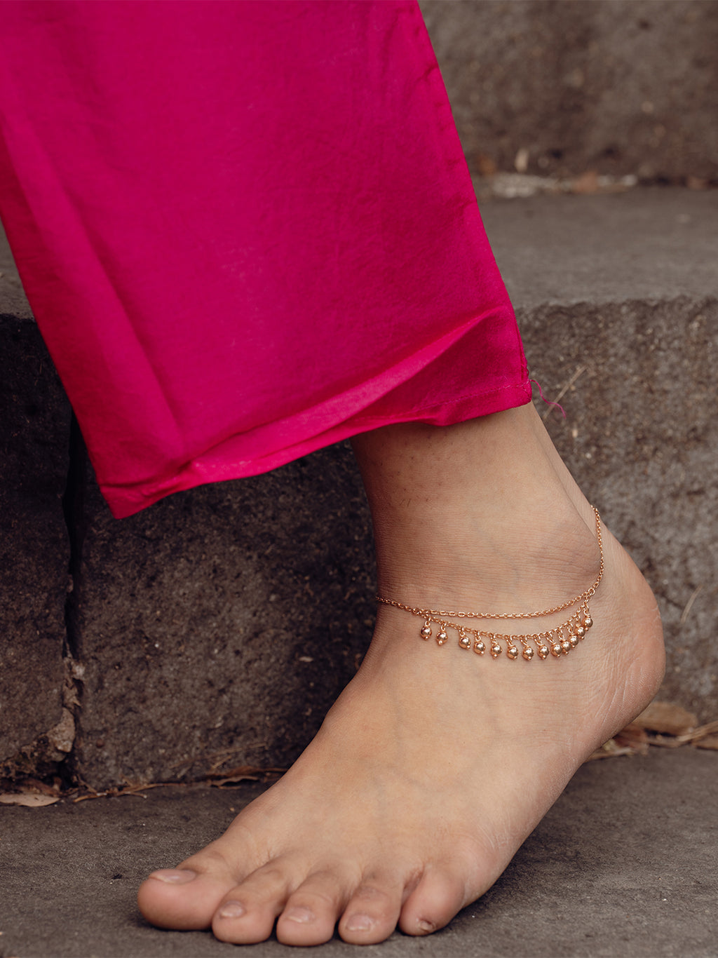 A traditional double-layered anklet (Payal) featuring delicate chains with tiny jingling bell charms for a soft, melodic sound. Finished in bright gold tone, this set of two offers a charming, classic look for both ankles.