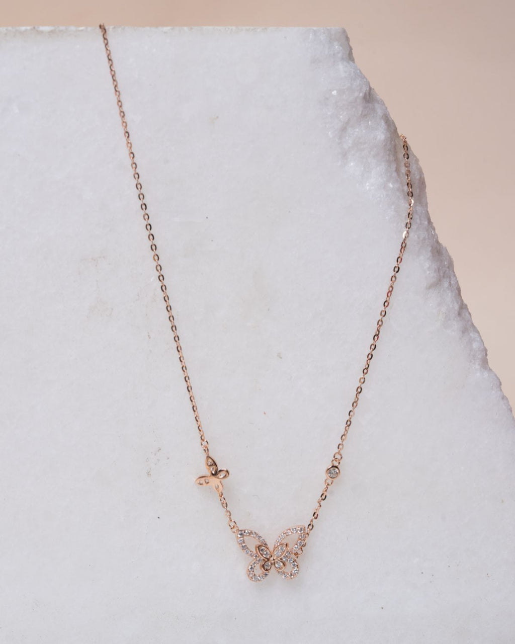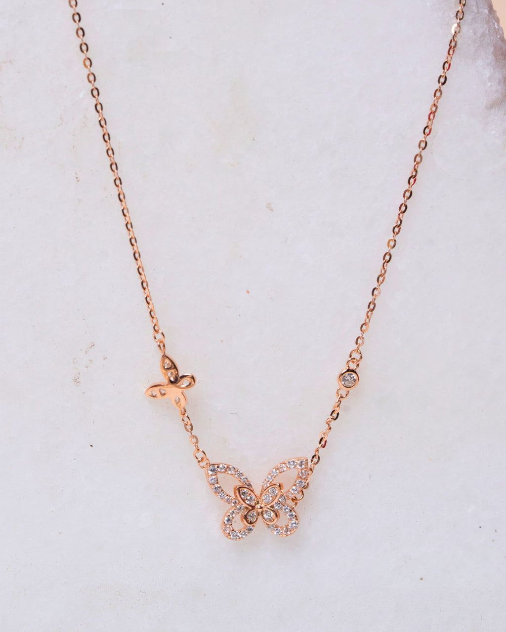 Graceful and radiant, this Dual Butterfly Necklace captures the essence of delicate beauty. It features two butterfly charms, one intricately detailed and the other subtle and playful, creating a balanced, modern look. The pave-set stones shimmer like tiny diamonds, while the rose gold finish lends a warm, feminine glow, making it a perfect accent for any occasion.