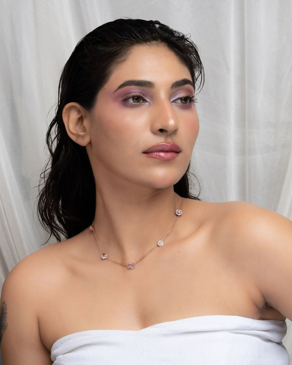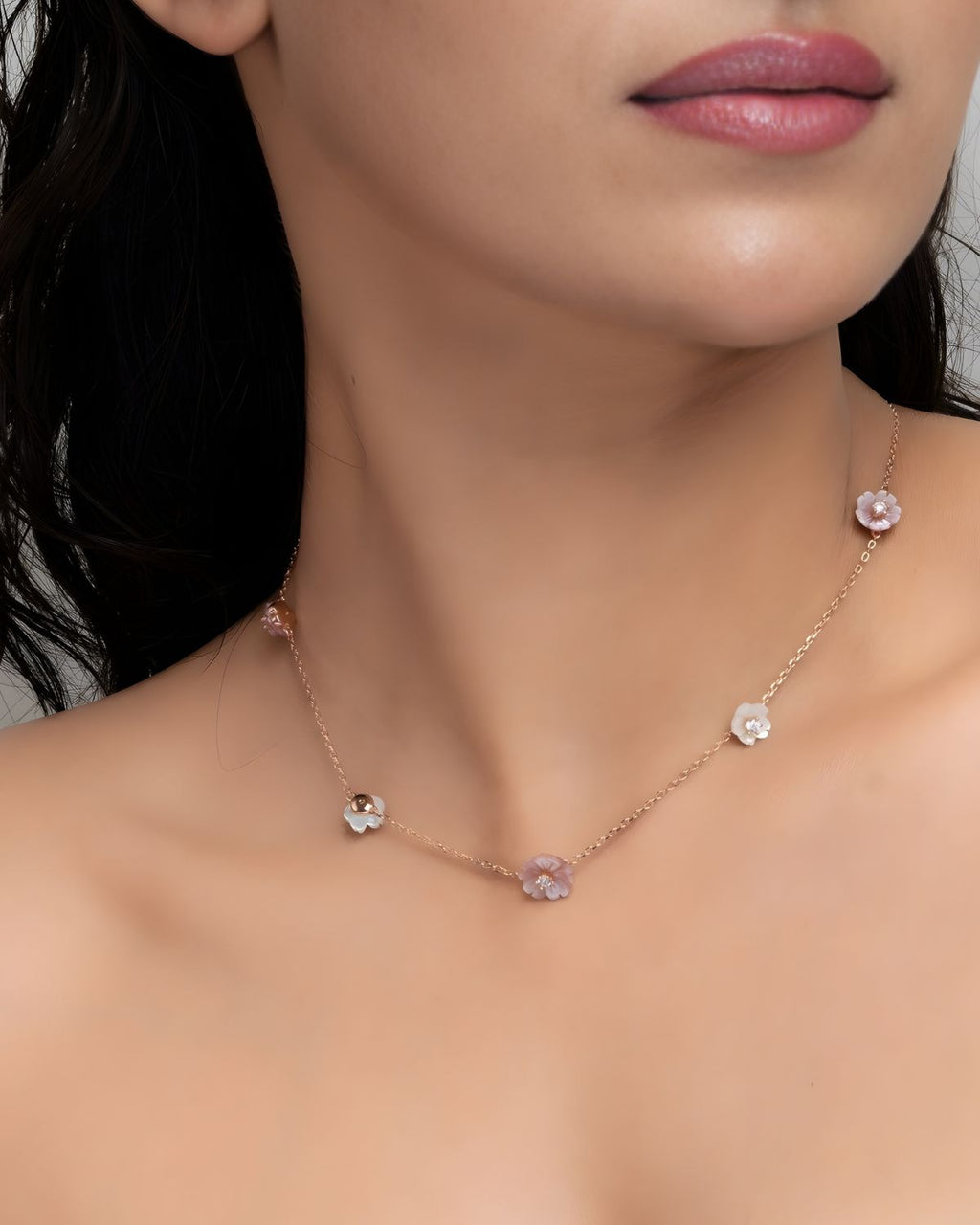 Softly feminine and effortlessly chic, this Rose Gold-Tone Flower Station Chain captures the charm of delicate craftsmanship. The floral charms, adorned with blush-toned mother-of-pearl inlays and a sparkling cubic zirconia at the center, reflect light with subtle grace. Perfect for layering or wearing solo, it adds a luminous touch of sophistication to any look.