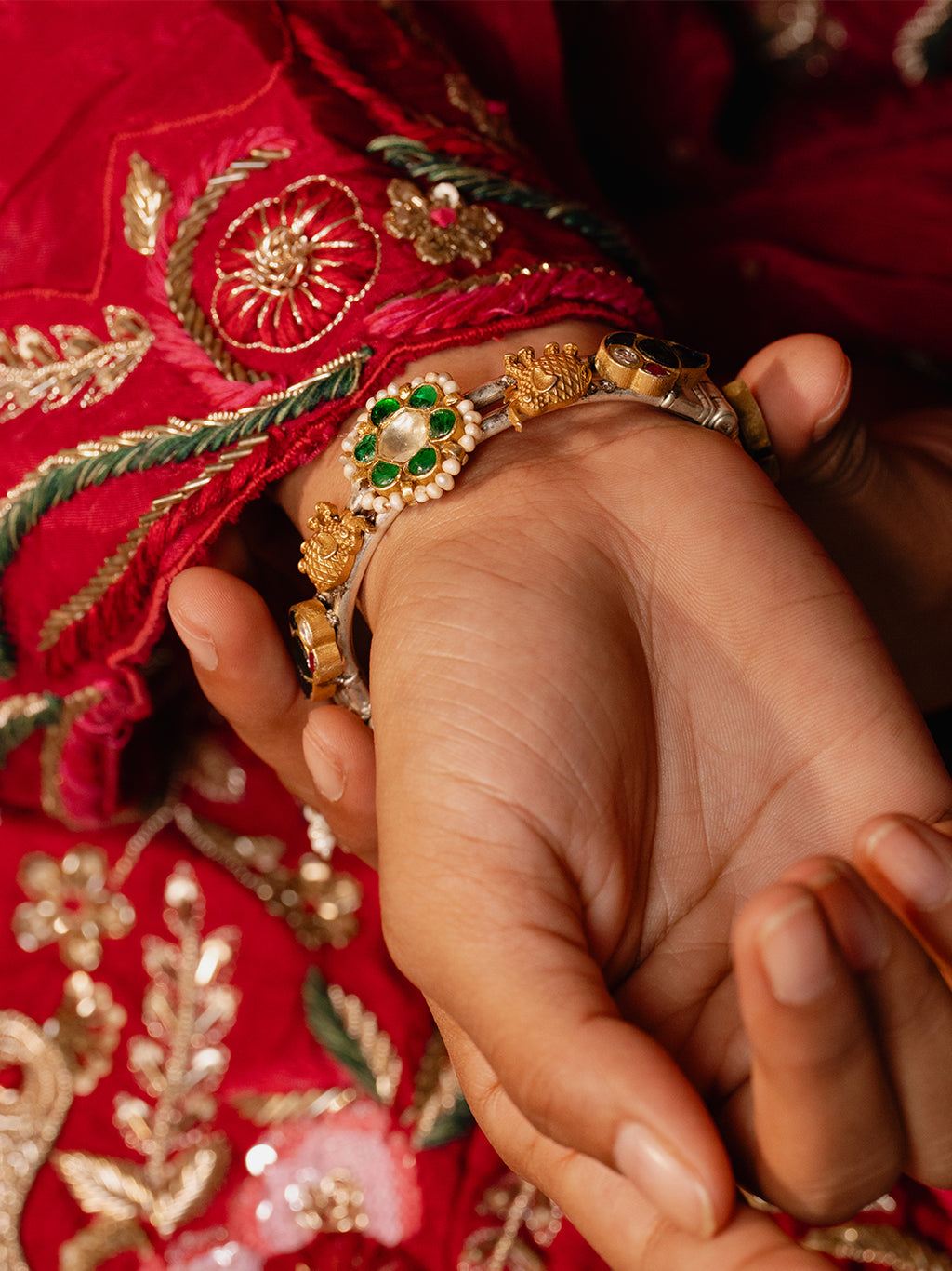 This free-size bangle beautifully blends traditional artistry with vibrant color. It features detailed Meenakari work, Kundan stones, and pearls, along with charming elephant and parrot motifs. The dual-tone finish of antique silver and gold-polished highlights adds a regal touch, making it a perfect choice for festive and ethnic occasions.