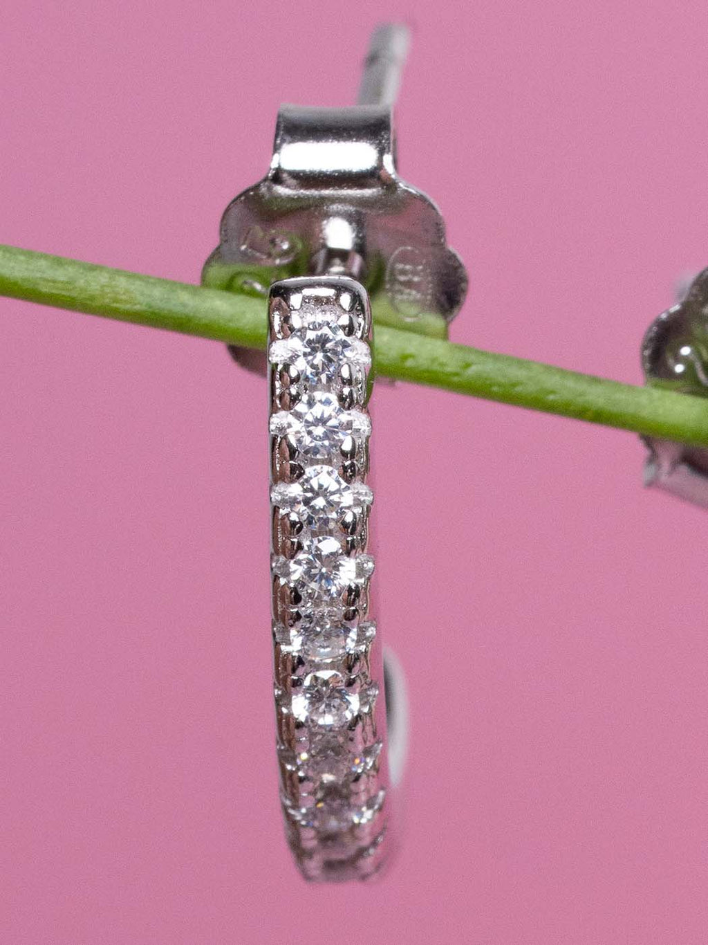 These petite half-hoop earrings feature a continuous line of sparkling micro-pave stones for a delicate, glittering effect. Designed as huggie-style hoops, they sit close to the earlobe with a polished silver-tone finish, perfect for everyday elegance.